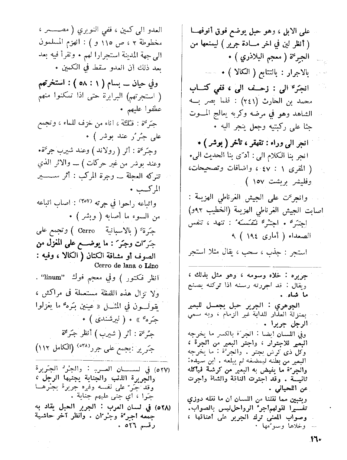 جَرةَّ (بالأسبانية Cerro) وتجمع على جَرّات وجَرَ: ما يوضع على المغزل من الصوف أو مشاقة الكتان (الكالا)، وفيه: Cerro de lana o Lino ( انظر فكتور) وفي معجم فوك linum. ولا تزال هذه اللفظة مستعملة في مراكش، يقولون في المثل (عينين بَرَّه ما يغزلوا جَرهَّ). (ليرشندي).