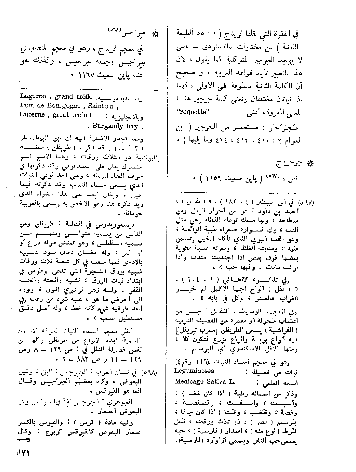 في الفقرة التي نقلها فريتاج (1: 55 الطبعة الثانية) من مختارات سلفستر دي ساسي لا يوجد الجرجير المتوكلية كما يقول، لن هذا التعبير تأباه قواعد العربية. والصحيح أن الكلمة الثانية معطوفة على الأولى، فهما إذا نباتان مختلفان وتعني كلمة جرجير هنا المعنى المعروف أعني ( roquette) مُجَرْجَر: مستحضر من الجرجير (ابن العوام 2: 410، 412، 414 وما يليها).