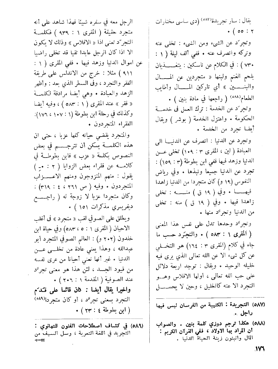 وتجرَّد وحدها تدل على نفس هذا المعنى (المقري 1: 583). والتجَرد حسب ما جاء في كلام (المقري 3: 164) هو التخلي عن كل شيء إلا عن الله تعالى الذي يرى فيه خليله الوحيد. ويقال: توجد أربعة دلائل على حب الله تعالى، أولها الإفلاس وهو التجرد إلا عنه كالخليل، وحين لا يحمل الرجل معه في سفره شيئا فهذا شاهد على إنه متجرد حقيقة (المقري 1: 939) فكلمة التجرّد تعني إذا (الإفلاس) وذلك لا يكون إلا إذا كان الرجل عابدا تقيا قد تخلى راضيا عن أموال الدنيا وزهد فيها. ففي المقري (1: 911) مثلا: خرج من الأندلس على طريقة الفقر والتجرد، وفي السطر الذي بعد: وأظهر الزهد والعبادة. وهي أيضاً مرادفة لكلمة (فقر) عند المقري (1: 583)، وفيه أيضاً وكذلك في رحلة ابن بطوطة (1: 107، 176): الفقراء المتجردون.