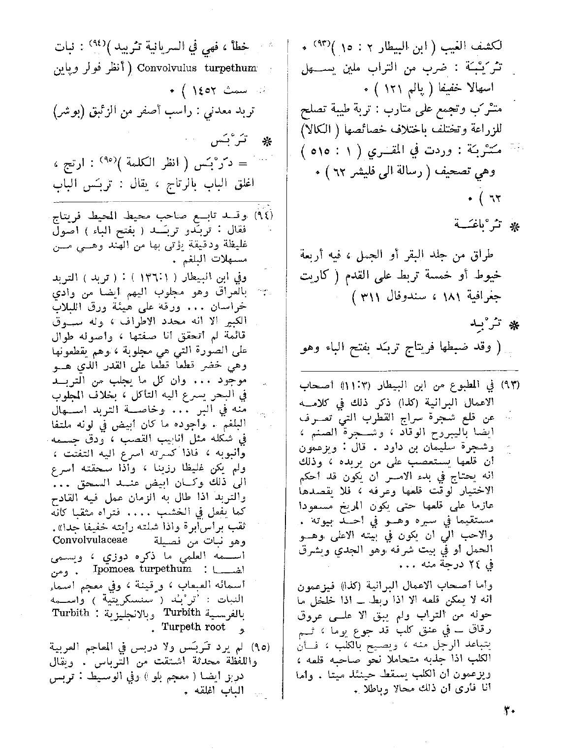 • تُرْبِد: (وقد ضبطها فريتاج تربَد بفتح الباء وهو خطأ في السريانية تُربيد): نبات Convolvulus turpethum ( أنظر فولر وباين سمث 1453).