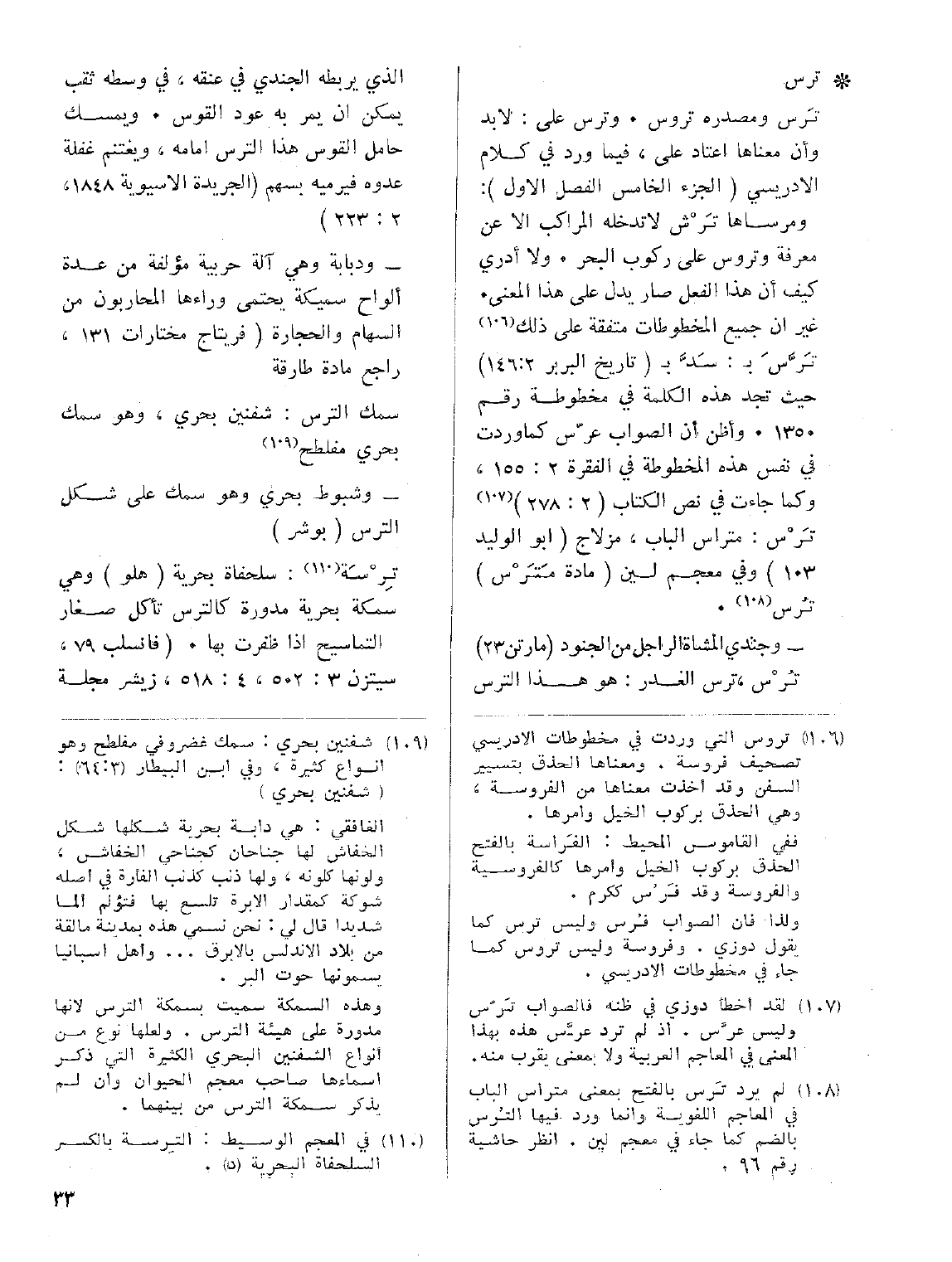 • ترس: تَرس ومصدره تروس. وترس على: لا بد وأن معناها اعتاد على، فيما ورد في كلام الادريسي (الجزء الخامس الفصل الأول): ومرساها تَرْش لا تدخله المراكب إلا عن معرفة وتروس على ركوب البحر. ولا أدري كيف أن هذا الفعل صار يدل على هذا المعنى. غير أن جميع المخطوطات متفقة على ذلك تَرَّسَ ب: (تاريخ البربر 2: 146) حيث تجد هذه الكلمة في مخطوطة رقم 1350. وأظن أن الصواب عرّس كما وردت في نفس هذه المخطوطة في الفقرة 2: 155، وكما جاءت في نص الكتاب (2: 278) تَرْس: متراس الباب، مزلاج (أبو الوليد 103) وفي معجم لين (مادة مَتَرْس) تُرس.