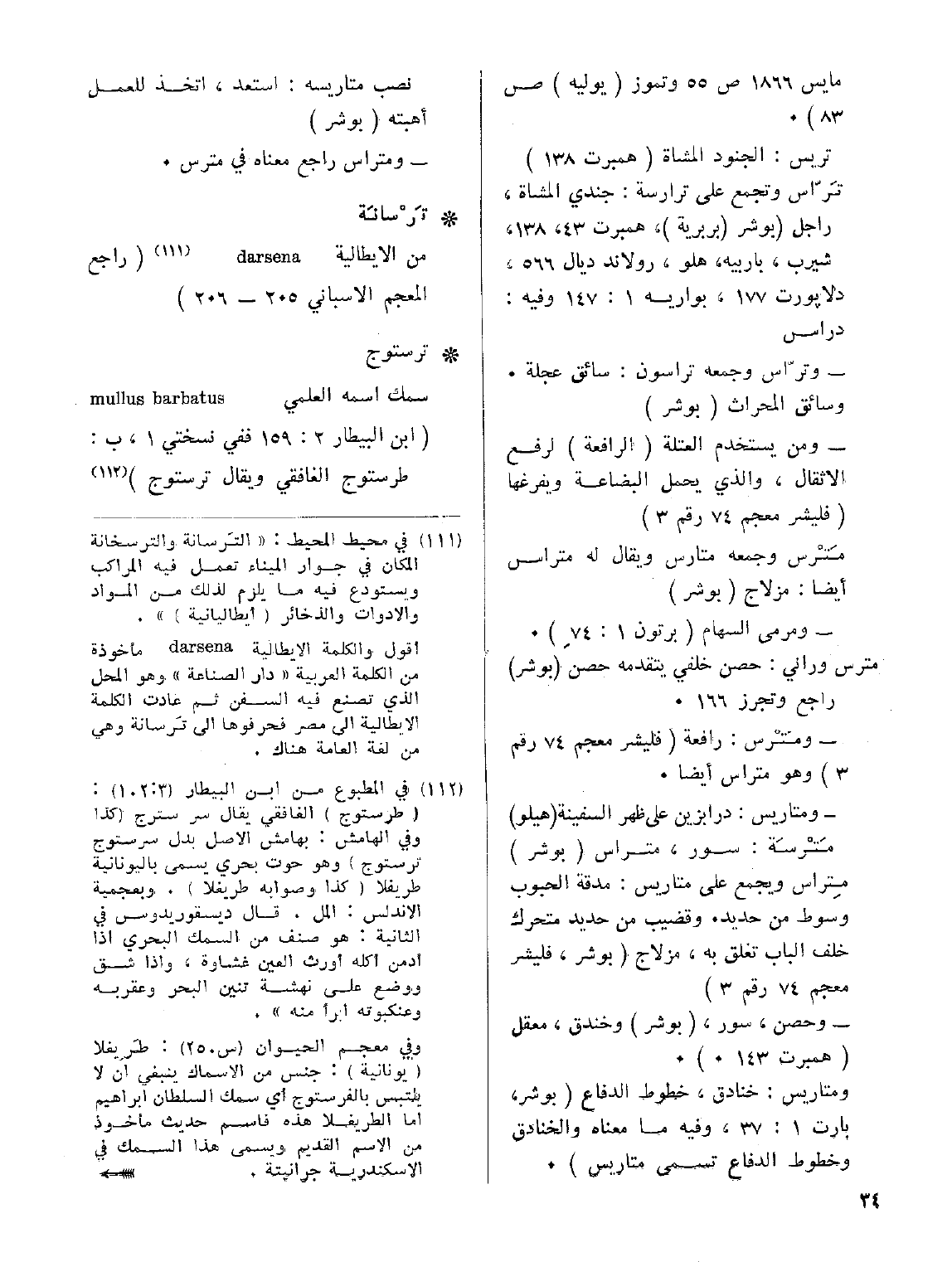 • تَرْسانَة: من الإيطالية darsena ( راجع المعجم الأسباني 205 - 206)