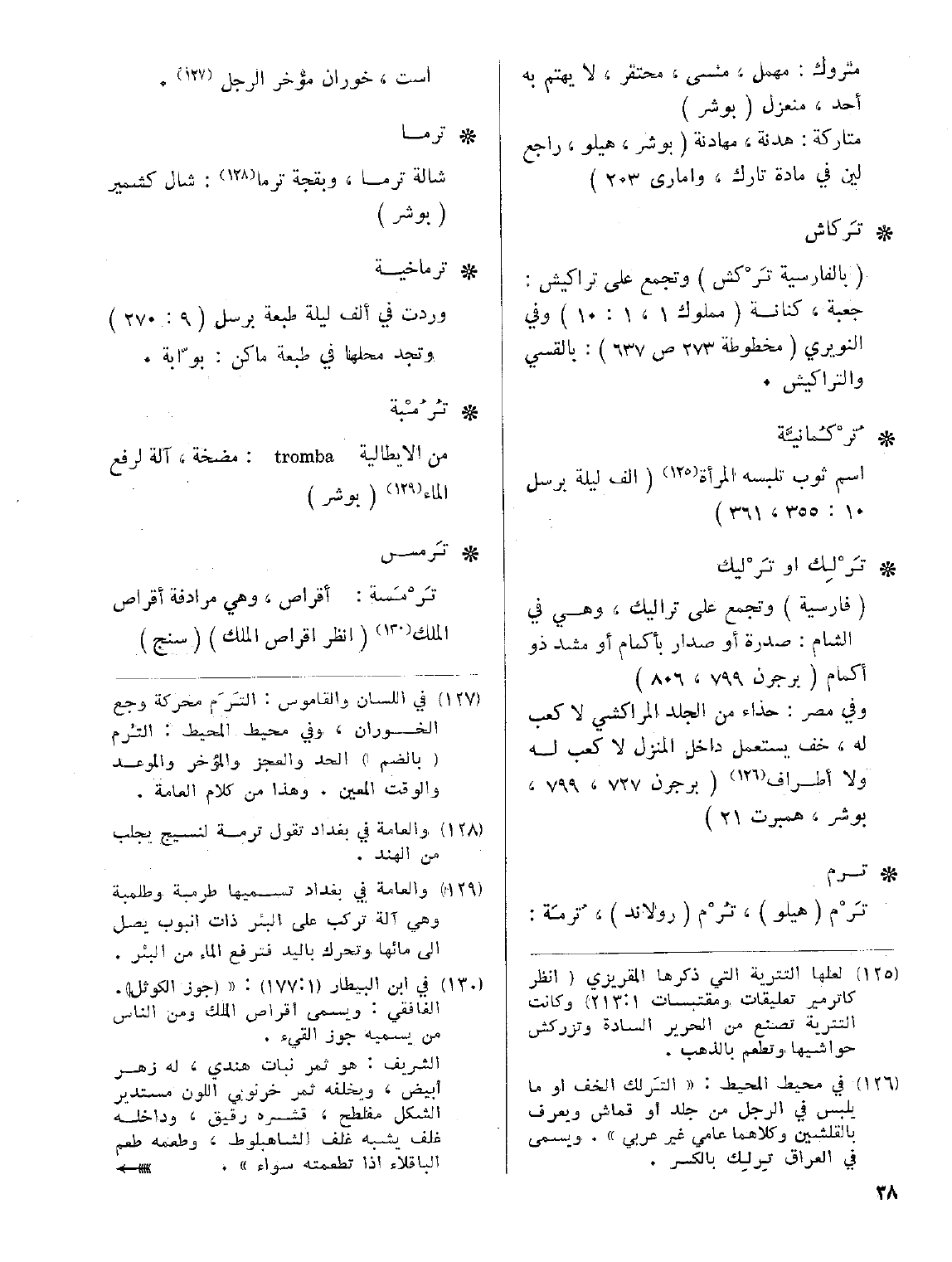 • ترماخية: وردت في ألف ليلة طبعة برسل (9: 270) وتجد محلها في طبعة ماكن: بوّابة.