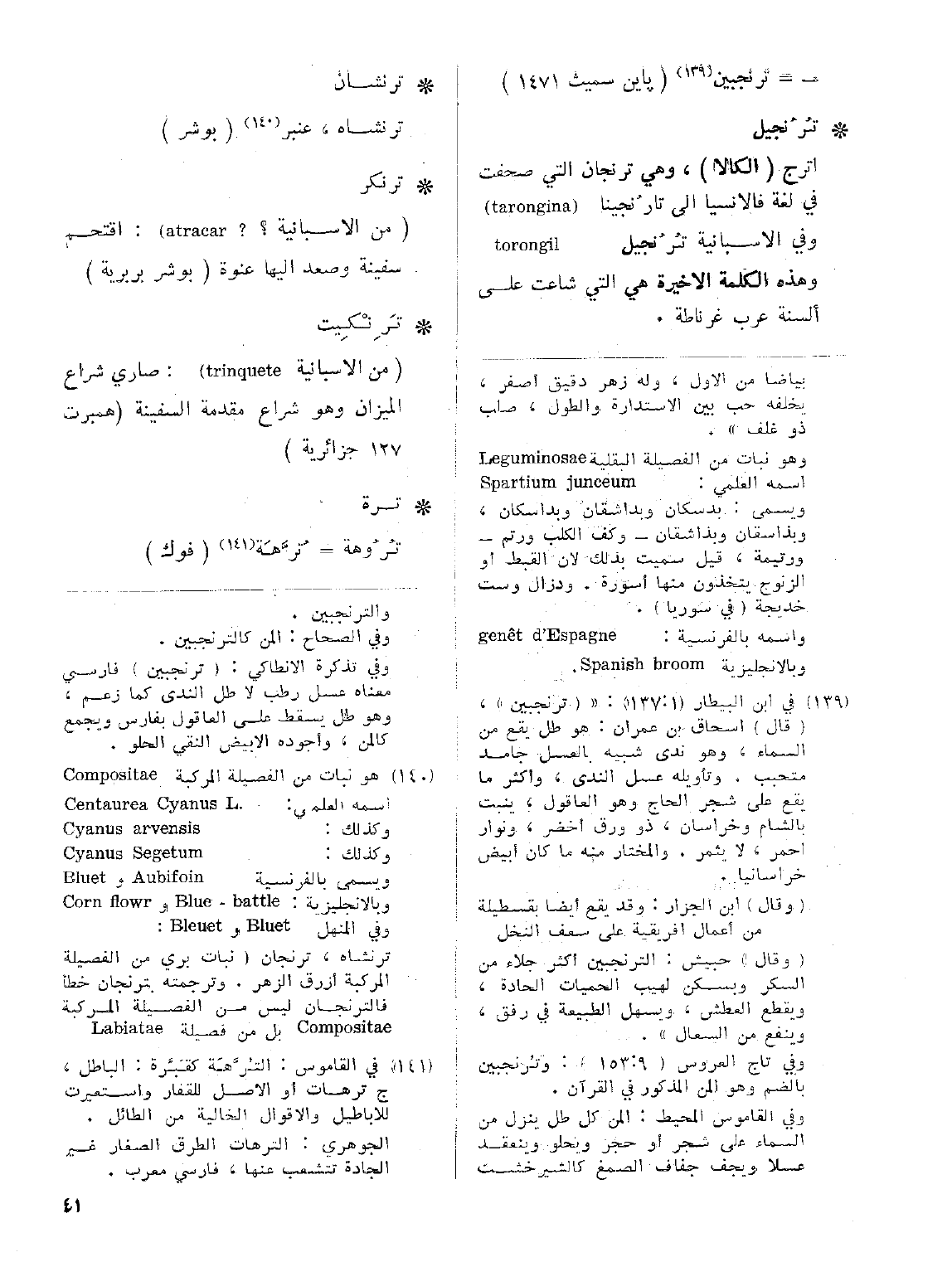 • تُرُنجبيل: اترج (الكالا)، وهي ترنجان التي صحفت في لغة فالانسيا إلى تارُنجينا ( tarongina) وفي الأسبانية تُرُنجيل torongil وهذه الكلمة الأخيرة هي التي شاعت على ألسنة عرب غرناطة.