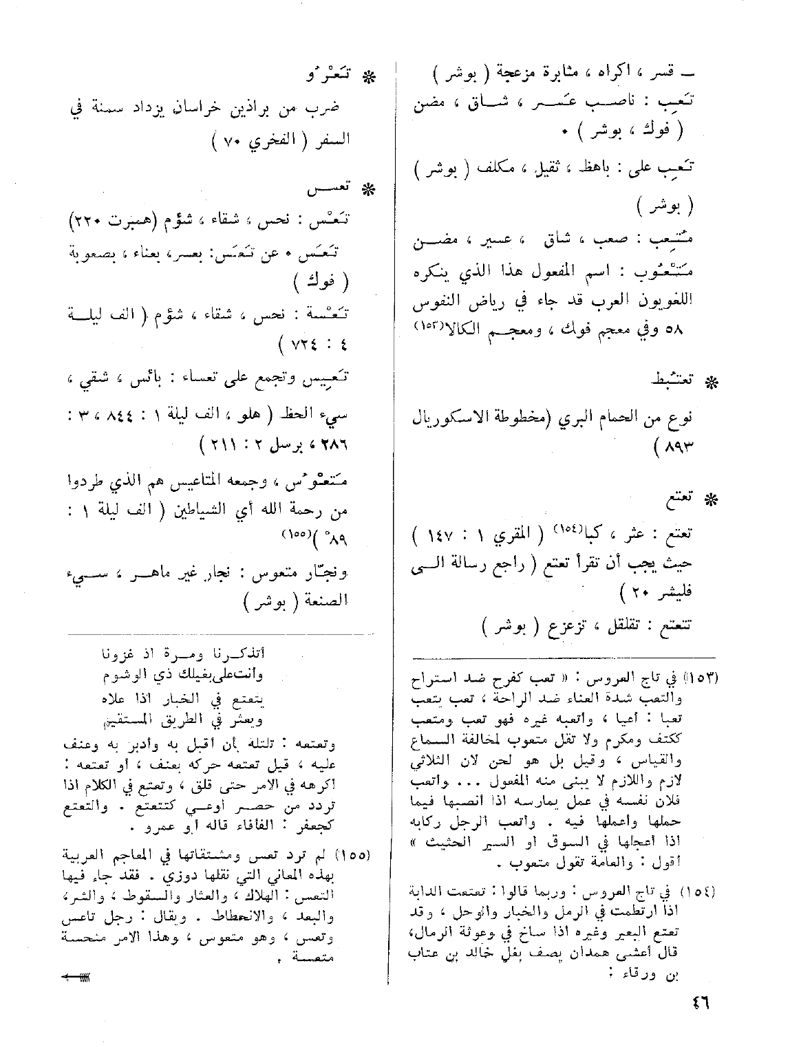 • تعس: تَعْس: نحِس، شقاء، شؤم (همبرت 220) تَعَس. عن تَعَس: بعسرة، بعناء، بصعوبة (فوك).