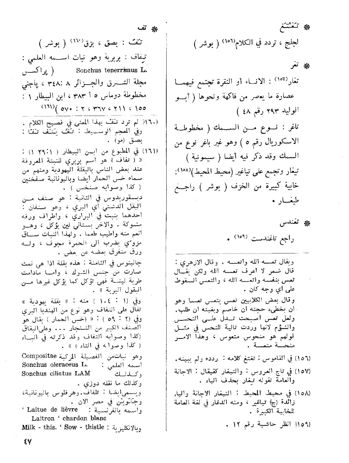 تِفاف: بربرية وهو نبات اسمه العلمي: Sonchus tenerrimus L. ( براكس مجلة الشرق والجزائر 8: 348، باجني مخطوطة دوماس 5أ 383، ابن البيطار 1: 155، 211، 367، 2: 570).