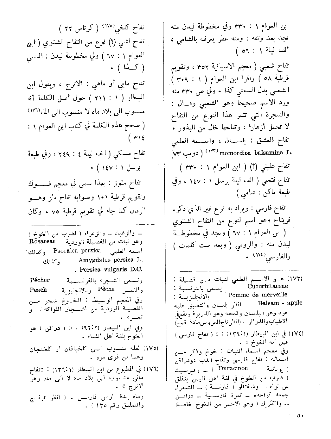 تفاح فارسي: ويراد به نوع غير الذي ذكره فريتاج وهو اسم لنوع من التفاح الشتوي (ابن العوام 1: 67) ونجد في مخطوطة ليدن منه: والرومي (وبعد ست كلمات) والفارسي.