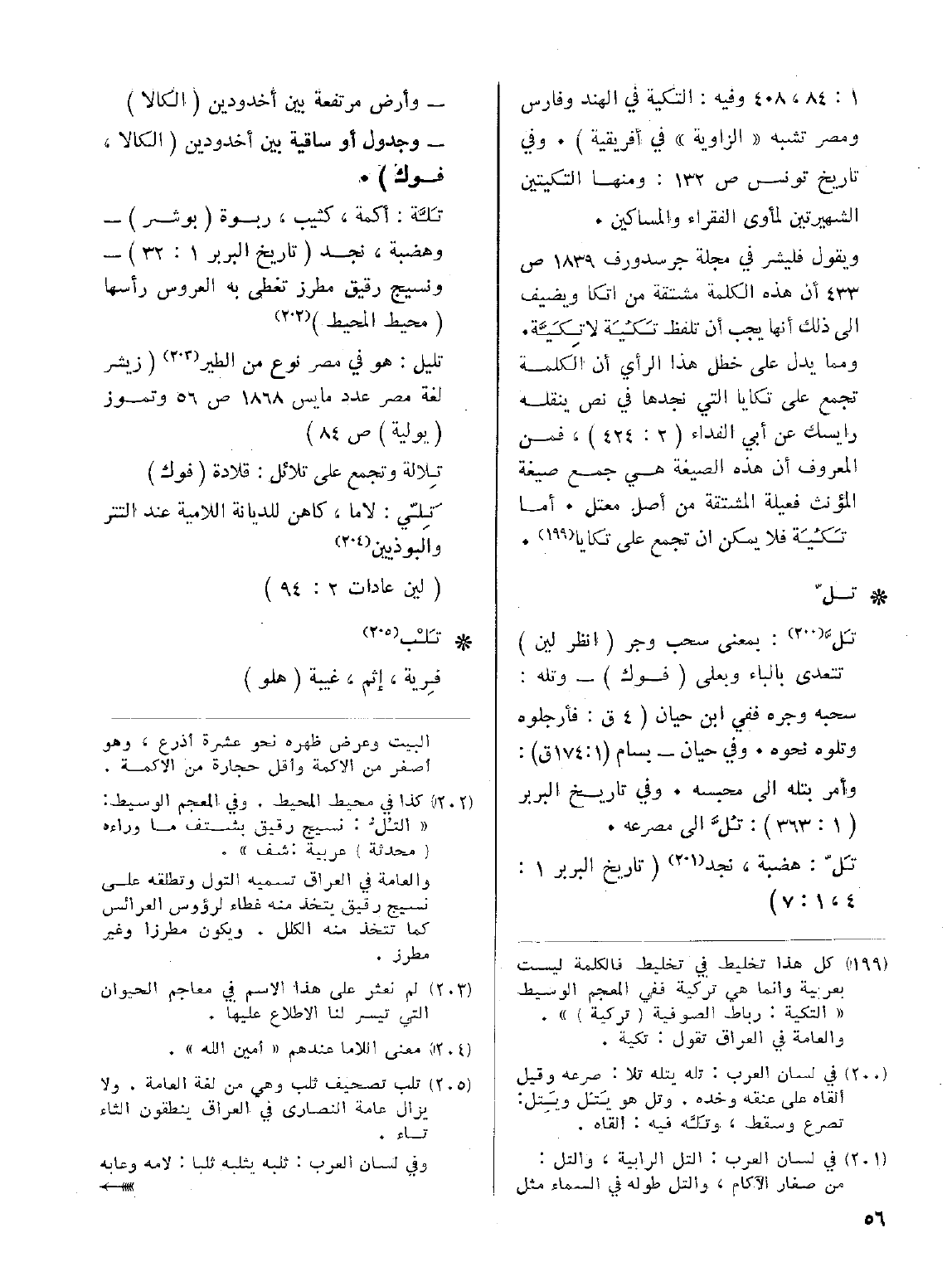 • تلّ: تَلَّ: بمعنى سحب وجر (انظر لين) تتعدى بالباء وبعلى (فوك) - وتله: سحبه وجره ففي ابن حيان (4ق: فأرجلوه وتلوه ونحوه. وفي حيان - بسام (1: 174ق): وأمر بتله إلى محبسه. وفي تاريخ البربر (1: 363): تُلَّ إلى مصرعه.