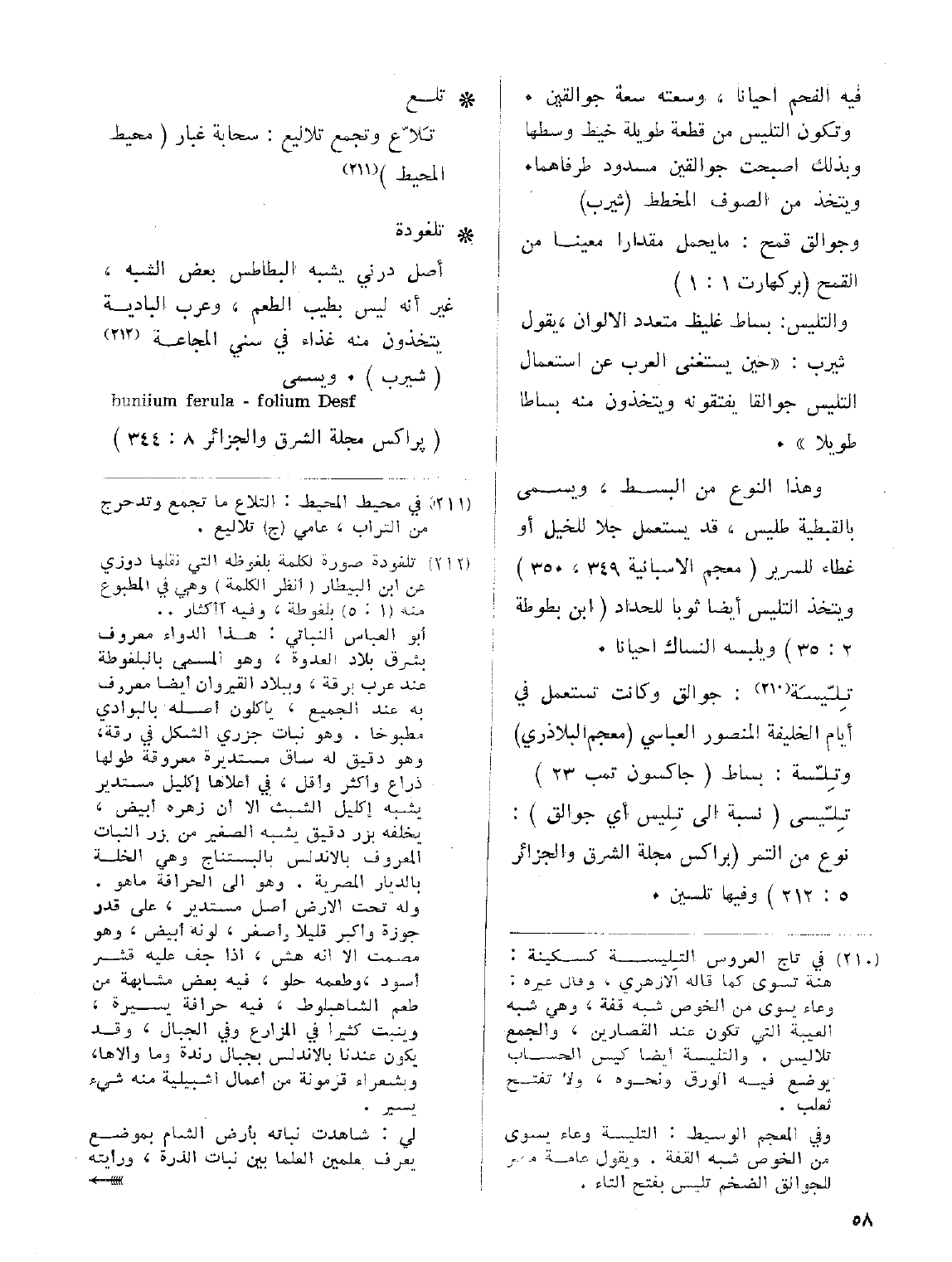 • تلغودة: أصل درني يشبه البطاطس بعض الشبه، غير إنه ليس بطيب الطعم، وعرب البادية يتخذون منه غذاء في سني المجامعة (شيرب). ويسمى buniium ferula - folium Desf ( براكس مجلة الشرق والجزائر 8: 344).