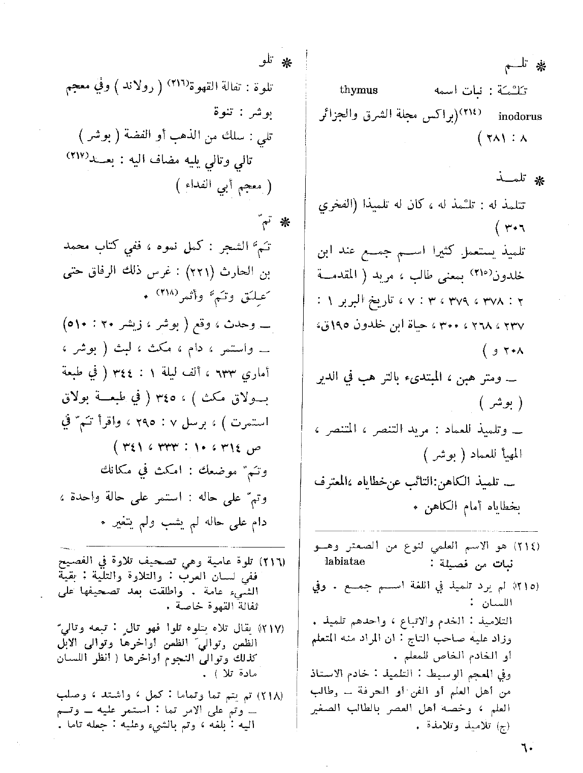 • تلم: نَلْمَة: نبات اسمه thymus inodorus ( براكس مجلة الشرق والجزائر 8: 281).