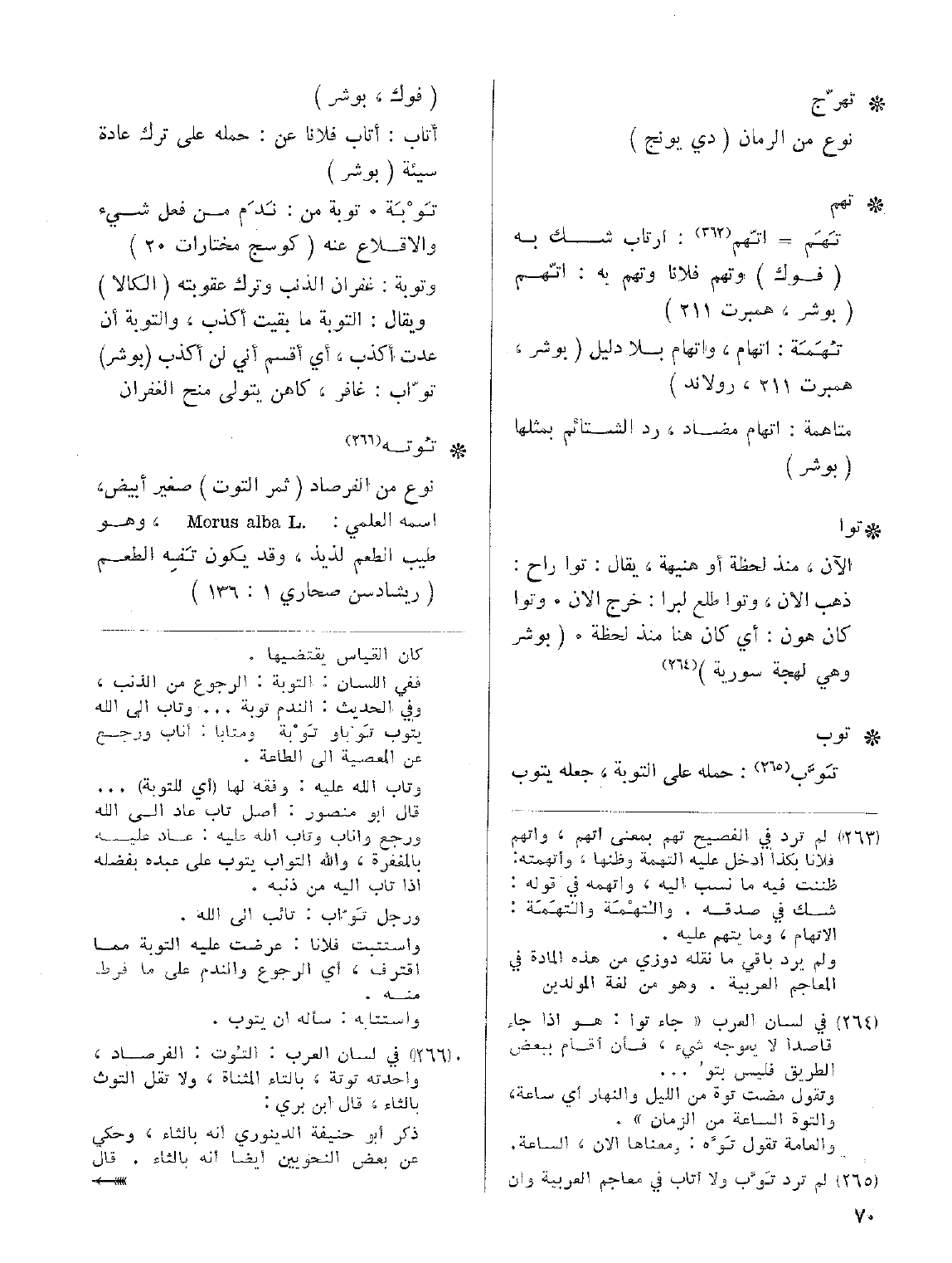 • تُوته: نوع من الفرصاد (ثمر التوت) صغير أبيض، اسمه العلمي: Morus alba L.، وهو طيب الطعم لذيذ، وقد يكون تَفِه الطعم (ريشاردسن صحاري 1: 136).