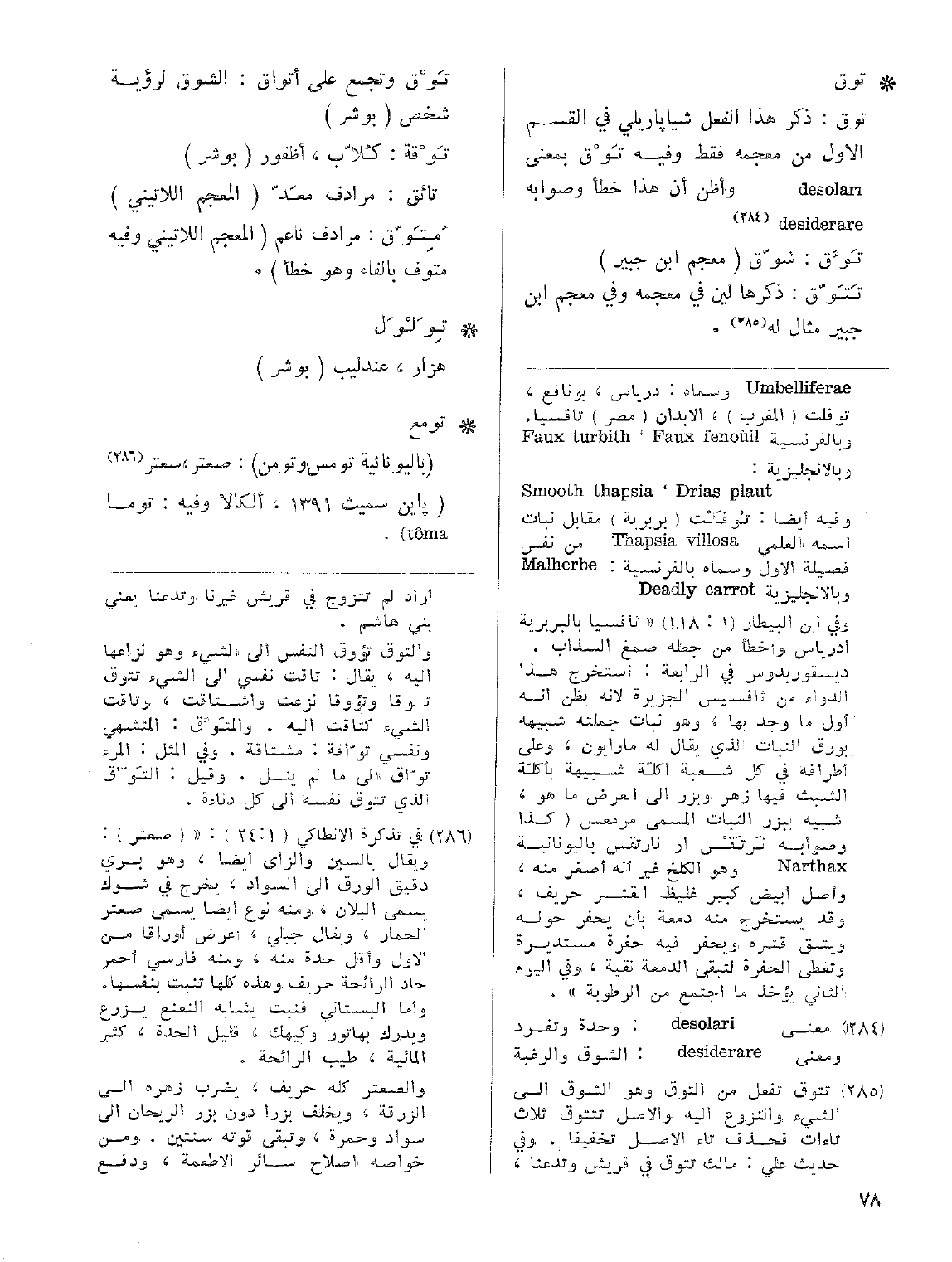 • توق: توق: ذكر هذا الفعل شياباريلي في القسم الأول من معجمه فقط وفيه تَوَّق بمعنى desolari وأظن أن هذا خطأ وصوابه desiderare.