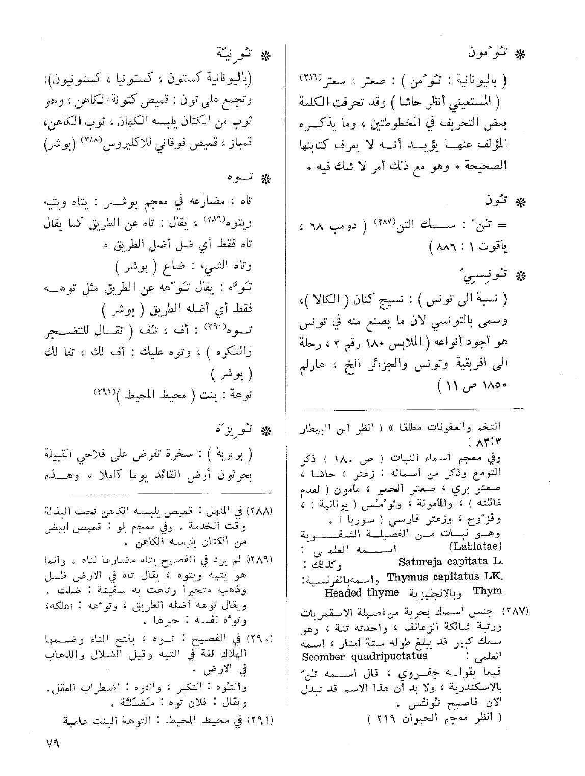 • تُو مُون: (باليونانية: تُوُ من): صعتر، سعتر (المستعيني أنظر حاشا) وقد تحرفت الكلمة بعض التحريف في المخطوطتين، وما يذكره المؤلف عنها يؤيد إنه لا يعرف كتابتها الصحيحة. وهو مع ذلك أمر لا شك فيه.