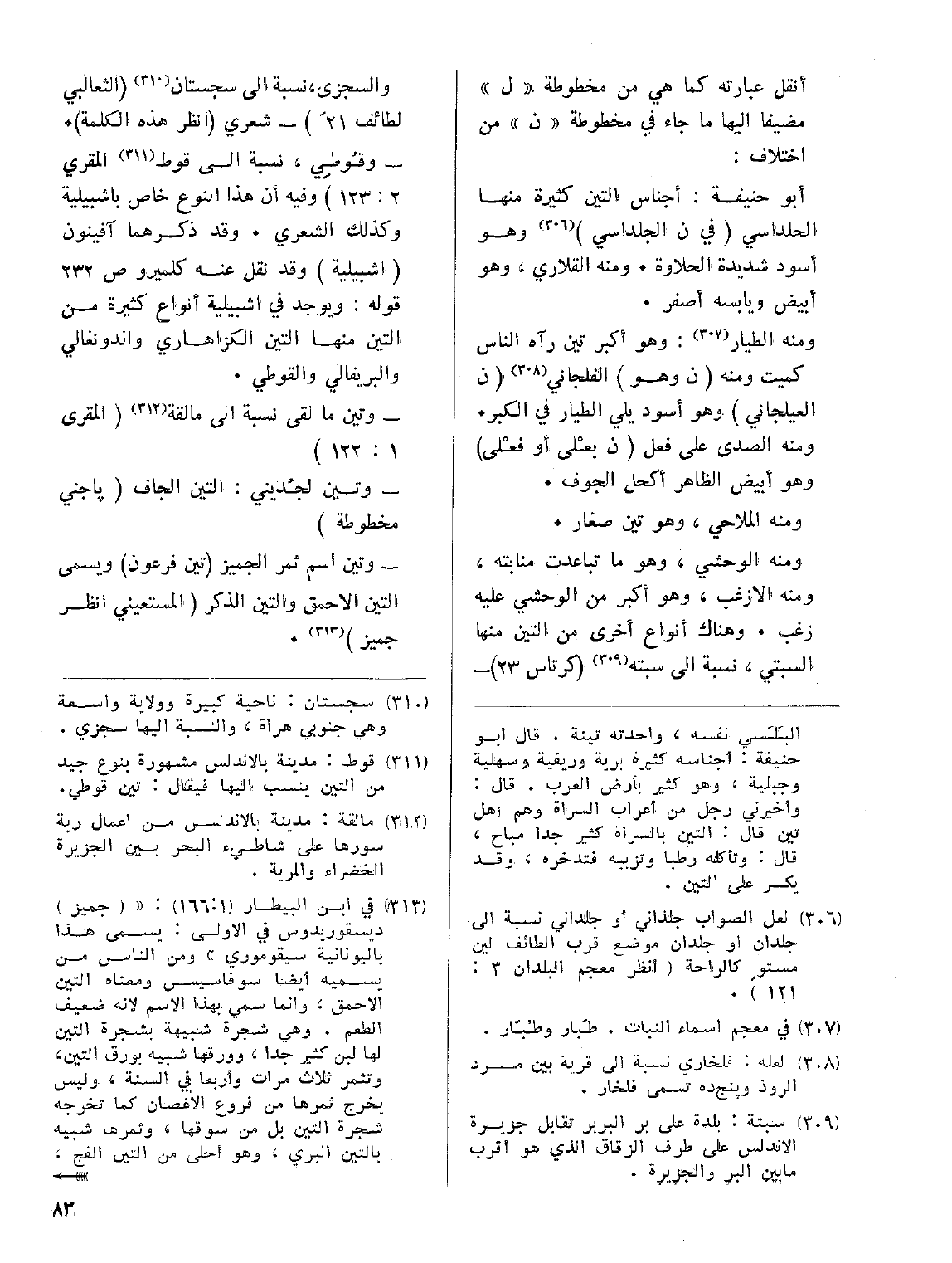 أنقل عبارته كما هي من مخطوطة (ل) مضيفا إليها ما جاء في مخطوطة (ن) من اختلاف: أبو حنيفة أجناس التين كثيرة منها الحلداسي (في ن الجلداسي) وهو أسود شديدة الحلاوة. ومنه القلاري، وهو أبيض ويابسه أصفر.