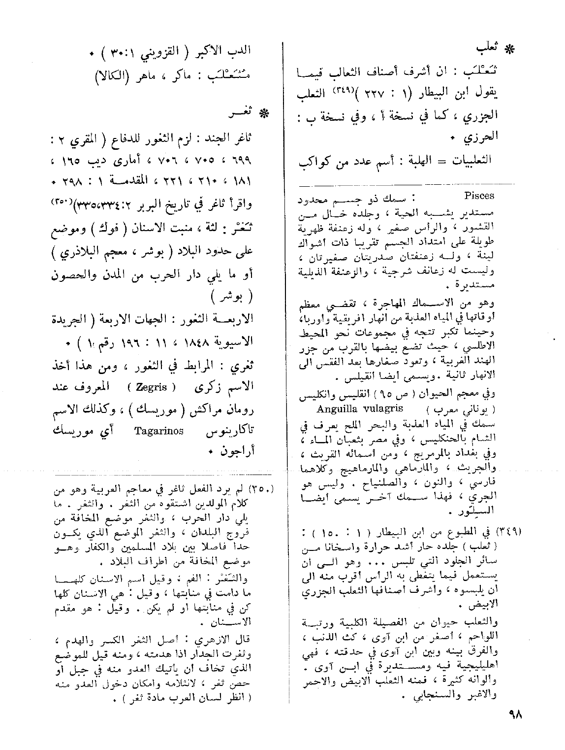 • ثعلب: ثَعْلَب: إن أشرف أصناف الثعالب فيما يقول ابن البيطار (1: 227) الثعلب الجزري، كما في نسخة أ، وفي نسخة ب: الحرزي.