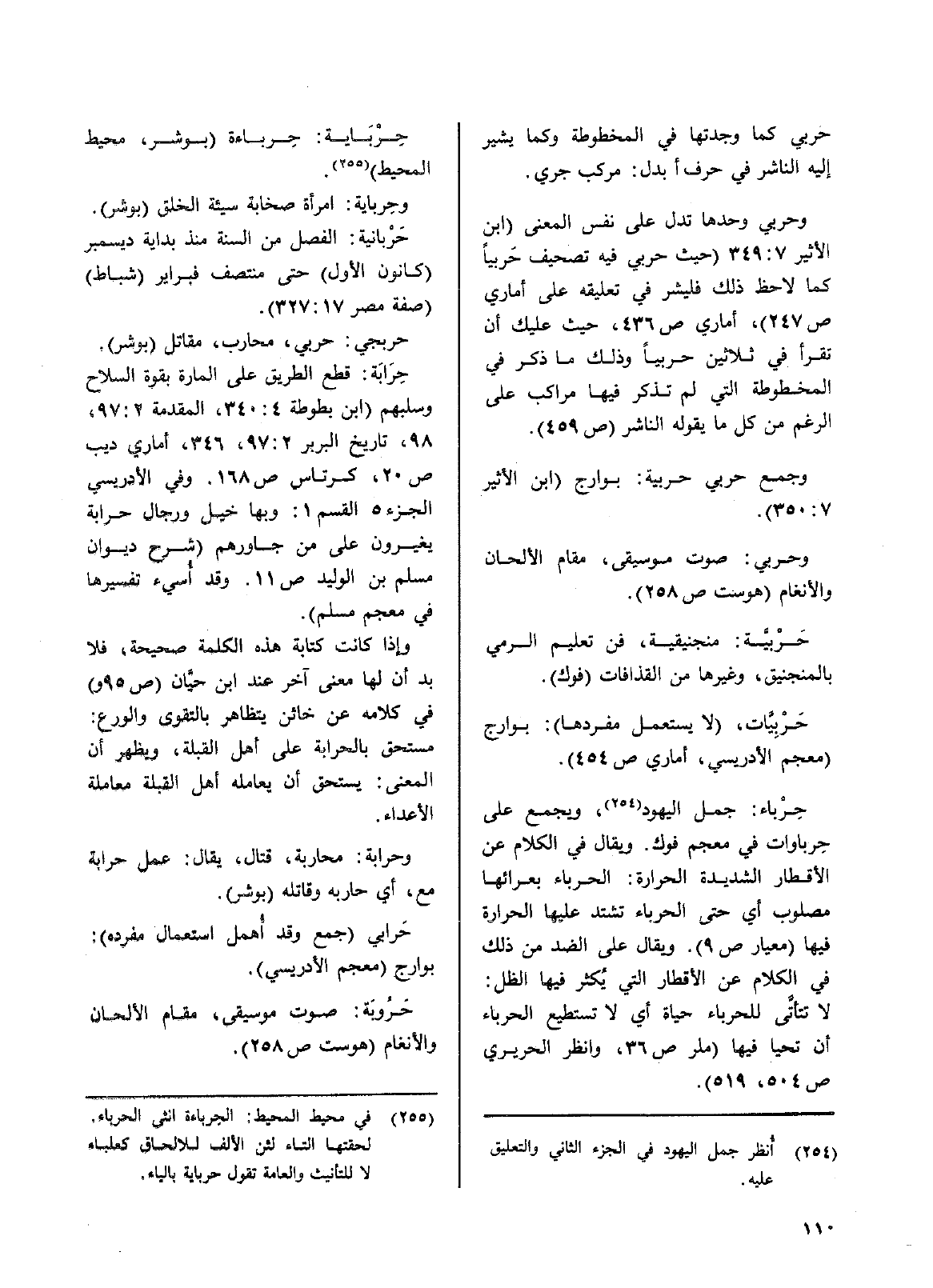وحربي وحدها تدل على نفس المعنى (ابن الأثير 7: 349) (حيث حربي فيه تصحيف حَربيا كما لاحظ ذلك فليش في تعليقه على أماري ص247) أماري ص436، حيث عليك أن تقرأ في ثلاثين حربيا وذلك ما ذكر في المخطوطة التي لم تذكر فيها مراكب على الرغم من كل ما يقوله الناشر (ص459).