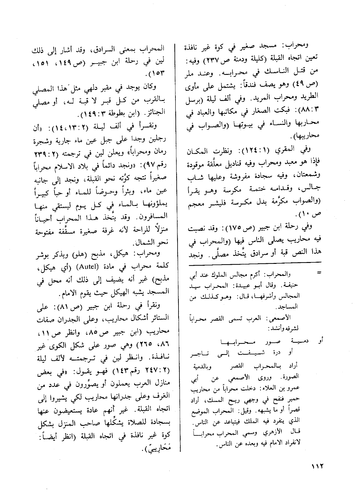 وفي رحلة ابن جبير (ص175): وقد نصبت فيه محاريب يصلى الناس فيها (والمحراب في هذا النص قبة أو سرادق يتخَّذ مصلَّى. ونجد المحراب بمعنى السرادق، وقد أشار إلى ذلك لين في رحلة ابن جبير (ص149، 151، 153).