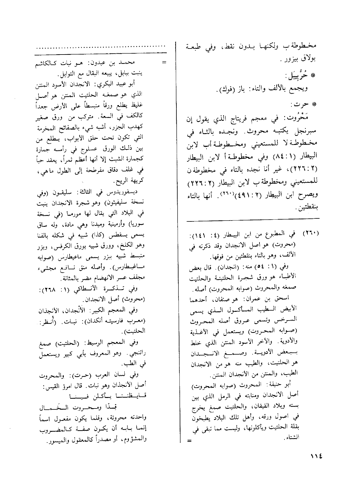 • حرت: مَحْرُوت: في معجم فريتاج الذي يقول إن سبرنجل يكتبه محروث، ونجده بالثاء في مخطوطة لا للمستعيني ومخطوطة ألابن البيطار (1: 84) وفي مخطوطة ألابن البيطار (2: 226) غير أنا نجده بالتاء في مخطوطة ن للمستعيني ومخطوطة ب لابن البيطار (2: 226) ويصرح ابن البيطار (2: 491). إنها بالتاء بنقطتين.