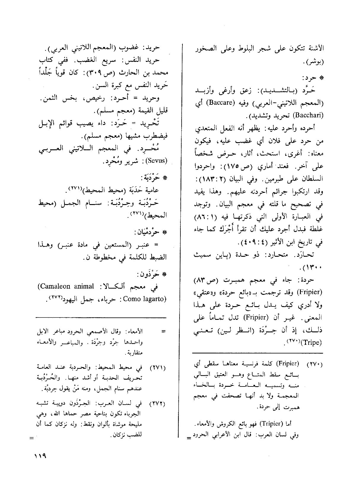 حردة: جاء في معجمهمبرت (ص83) ( fripier) وقد ترجمت ب ((بائع حردة)) و ((عتقي)). ولا أدري كيف يدل بائع حردة على هذا المعنى. غير أن ( Fripier) تدل تماما على ذلك إذ أن حِرْدَة (انظر لين) تعني ( Tripe) .