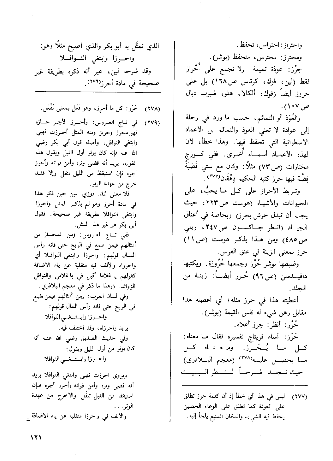 حَرَز: أساء فريتاج تفسيره فقال ما معناه: كل ما يُحَرز ومعناه كل ما يحصل عليه (معجم البلاذري) حيث تجد شرحا لشطر البيت الذي تمثَّل به أبو بكر والذي اصبح مثلاً وهو: وأحرز وابتغي النوافلا وقد شرحه لين غير انه ذكره بطريقة غير صحيحة في مادة أحرز.