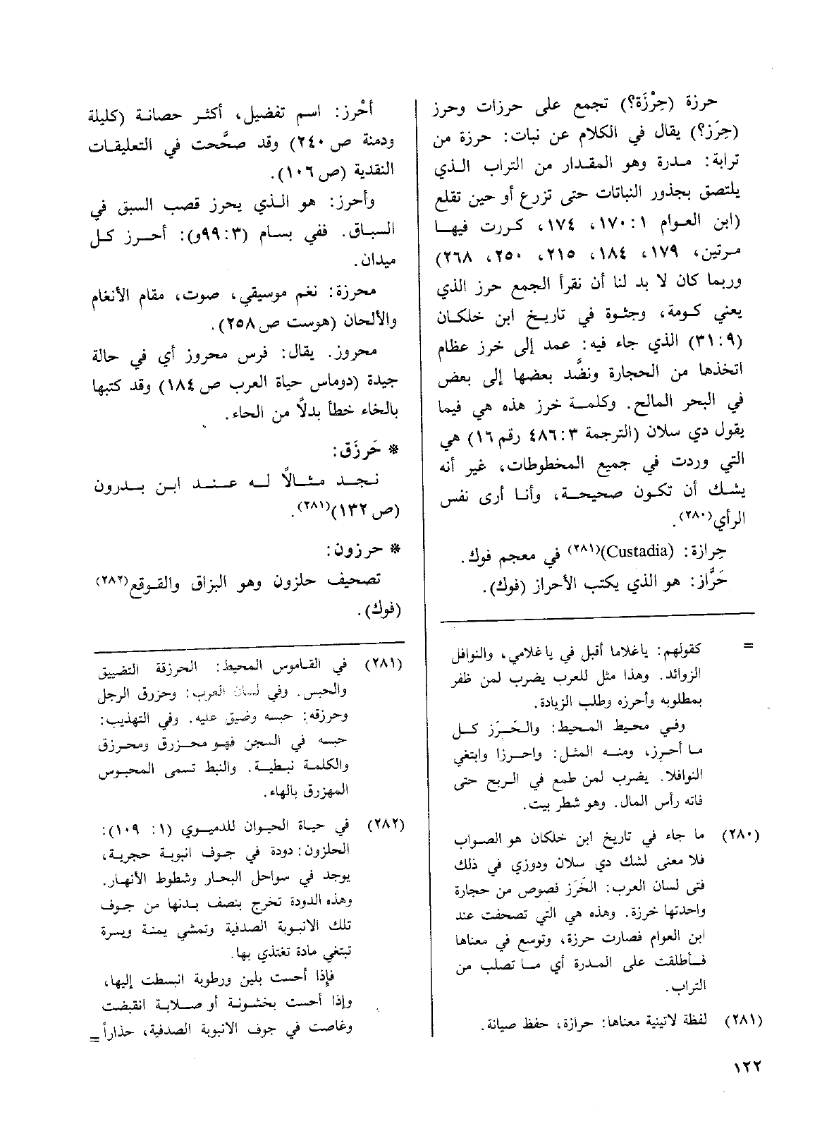 حرزة (حِرْزَة؟) تجمع على حرزات وحرز (حِرَز.؟) يقال في الكلام عن نبات: حرزة من ترابة: مدرة وهو المقدار من التراب الذي يلتصق بجذور النباتات حتى تزرع أو حين تقلع (ابن العوام 1: 170، 174، كررت فيها مرتين، 179، 184، 215، 250، 268) وربما كان لابد لنا أن نقرأ الجمع حرز الذي يعني كومة، وجثوة في تاريخ ابن خلكان (9: 31) الذي جاء فيه: عمد إلى خرز عظام اتخذها من الحجارة ونضدَّ بعضها إلى بعض في البحر المالح. وكلمة حرز هذه هي فيما يقول دي سلان (الترجمة 3: 486 رقم 16) هي التي وردت في جميع المخطوطات غير أنه يشك أن تكون صحيحة وأنا أرى نفس الرأي.
