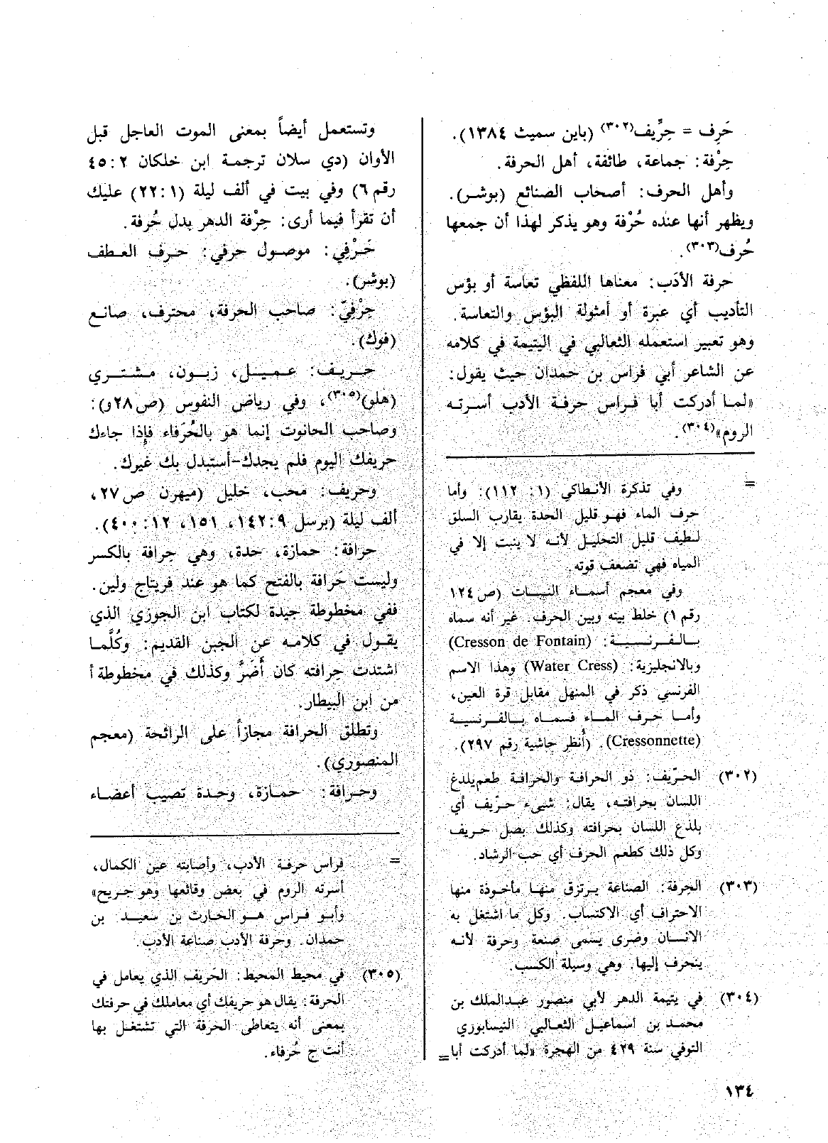 وتستعمل أيضاً بمعنى الموت العاجل قبل الأوان (دي سلان ترجمة ابن خلكان 2: 45، رقم 6) وفي بيت ألف ليلة (1: 22) عليك أن تقرأ فيما أرى: حِرْفة الدهر بدل حُرفة.