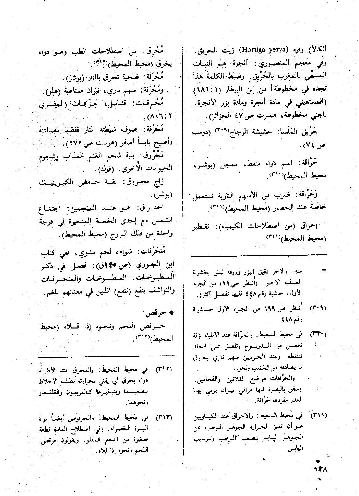 مُتَحرِّقات: شواء، لحم مشوي، ففي كتاب ابن الجوزي (ص 145 ق): فصل في ذكر المطبوخات المطبوخات والمتحرقات والنواشف ينفع (تنفع) الذين في معدتهم بلغم.