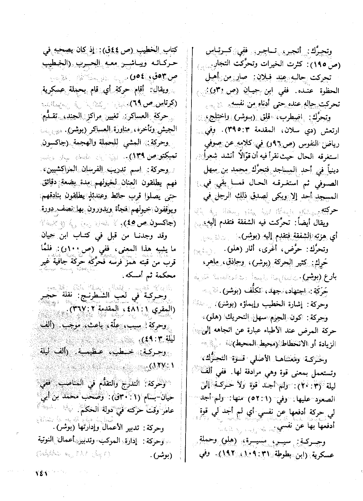 وحركة معناها الأصلي قوة التحرُّك، وتستعمل بمعنى قوة وهي مرادفة لها، ففي ألف ليلة (3: 20): ولم أجد قوة ولا حركة إلى الصعود إليها. وفي (1: 52) منها: ولم أجد لي حركة أدفعها عن نفسي أي لم أجد لي قوة ادفعها بها عن نفسي.