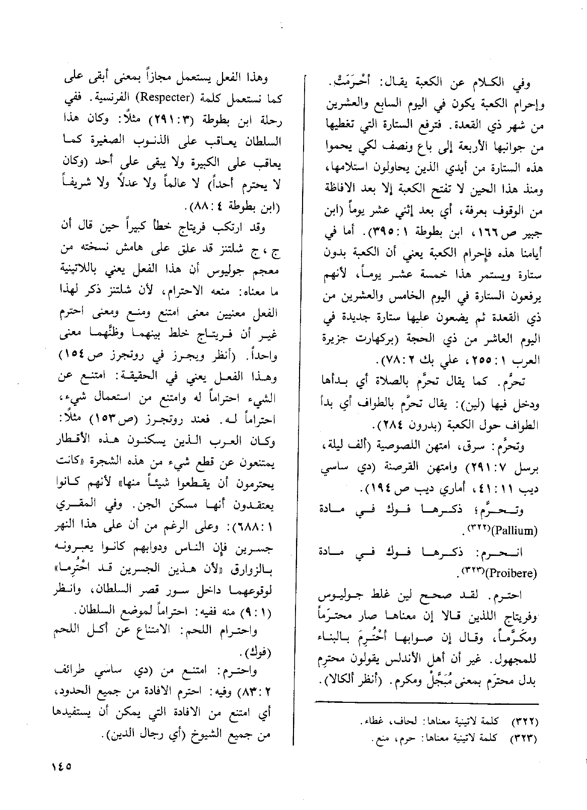 وقد ارتكب فريتاج خطا كبير حين قال إن ج، ج شلتنز قد علق على هامش نسخته من معجم جوليوس إن هذا الفعل يعني باللاتينية ما معناه: منعه الاحترام، لأن شلتنز ذكر لهذا الفعل معنيين معنى امتنع ومنع ومعنى احترم غير أن فريتاج خلط بينهما وظنَّهما معنى واحدا (انظر ويجرز في روتجرز ص154) وهذا الفعل يعني في الحقيقة: امتنع عن الشيء احتراما له وامتنع من استعمال شيء احتراما له. فعند روتجرز (ص153) مثلا: وكان العرب الذين يسكنون هذه الأقطار يمتنعون عن قطع شيء من هذه الشجرة ((كانت يحترمون أن يقطعوا شيئا منها)) لأنهم كانوا يعتقدون إنها مسكن الجن. وفي المقري (1: 688): وعلى الرغم من إن على هذا النهر جسرين فإن الناس ودوابهم كانوا يعبرونه بالزوارق ((لأن هذين الجسرين كانا قد احْتُرِما)) لوقوعهما داخل سور قصر السلطان. وانظر (1: 9) منه ففي: احتراما لموضع السلطان.