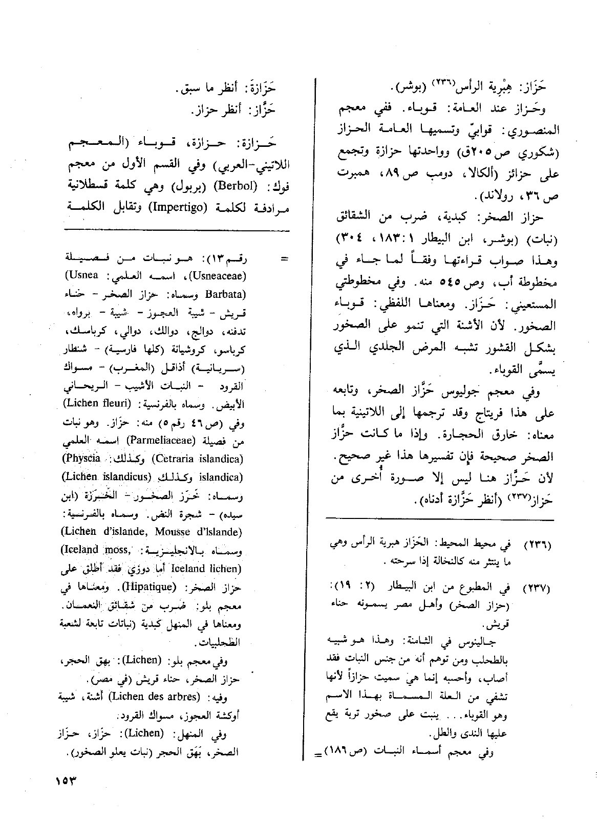 حزاز الصخر: كبدية، ضرب من الشقائق (نبات) (بوشر، ابن البيطار 1: 183،304) وهذا صواب قراءتها وفقا لما جاء في مخطوطة أب وص 545 منه، وفي مخطوطتي المستعيني: حَزَاز. ومعناها اللفظي: قوباء الصخور. لأن الاشنة التي تنمو على الصخور بشكل القشور تشبه المرض الجلدي الذي يسمى القوباء.