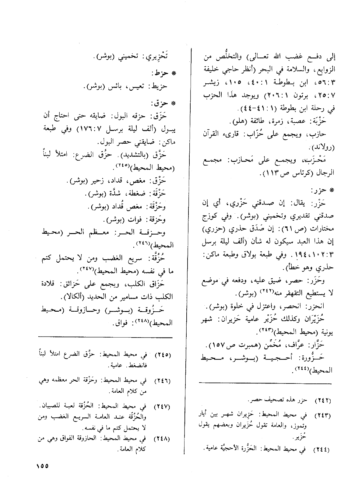 • حزر: حَزْر: يقال: إن صدقني حَزْري، أي إن صدقني تقديري وتخميني (بوشر) وفي كوزج مختارات (ص61): إن صَدَق حذري (حزري) إن هذا العبد سيكون له شأن (ألف ليلة برسل 3: 102، 194. وفي طبعة بولاق وطبعة ماكن: حذري وهو خطأ).