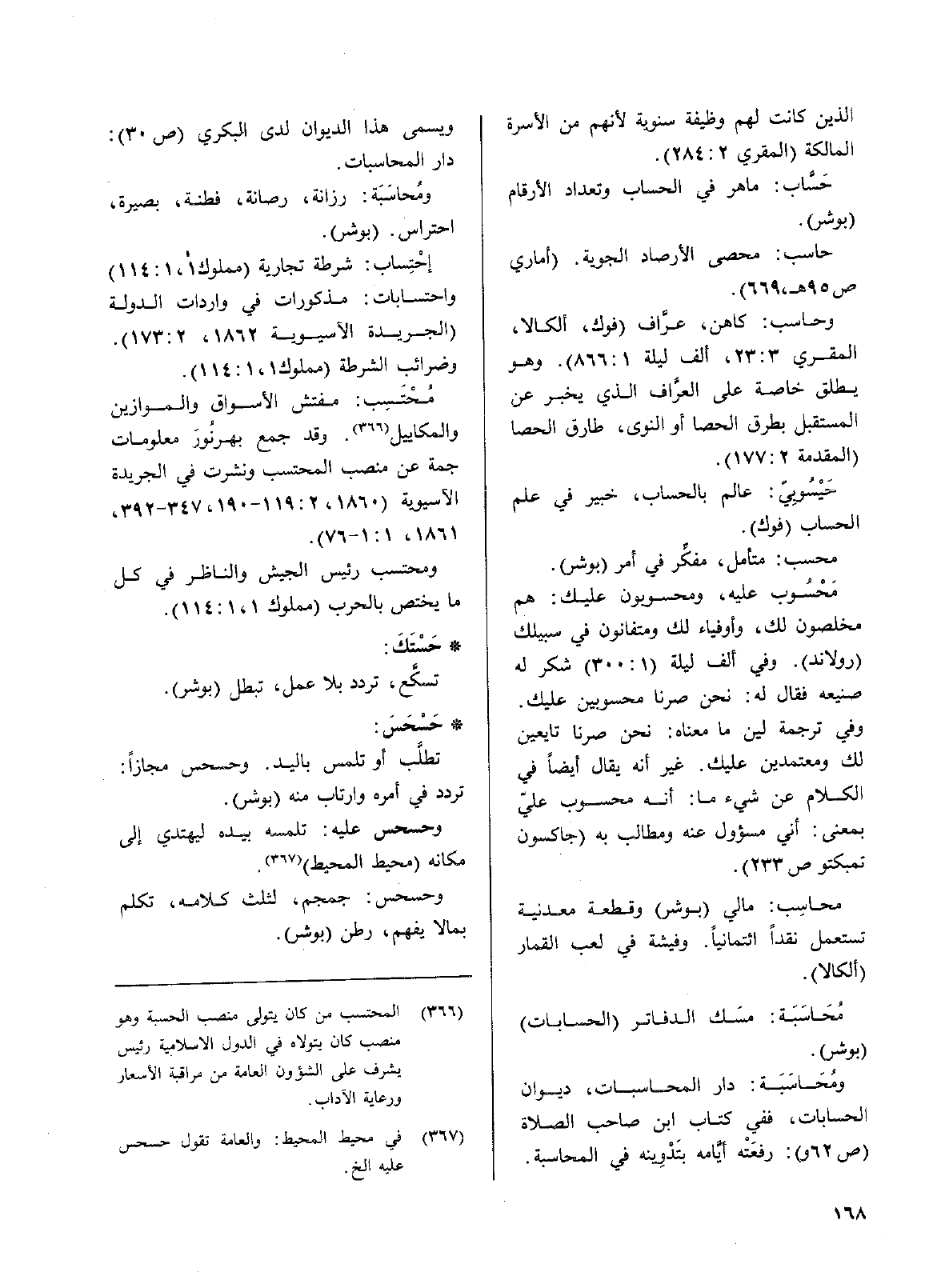 واحتسابات: مذكورات في واردات الدولة (الجريدة الآسيوية 1862، 2: 173) وضرائب الشرطة (مملوك 1، 1: 114) مُحْتَسِب: مفتش الأسواق والموازين والمكاييل وقد جمع بهرنُورَ معلومات جمة عن منصب المحتسب ونشرت في الجريدة الآسيوية (1860، 2: 119 - 190، 347 - 392، 1861، 1: 1 - 76).