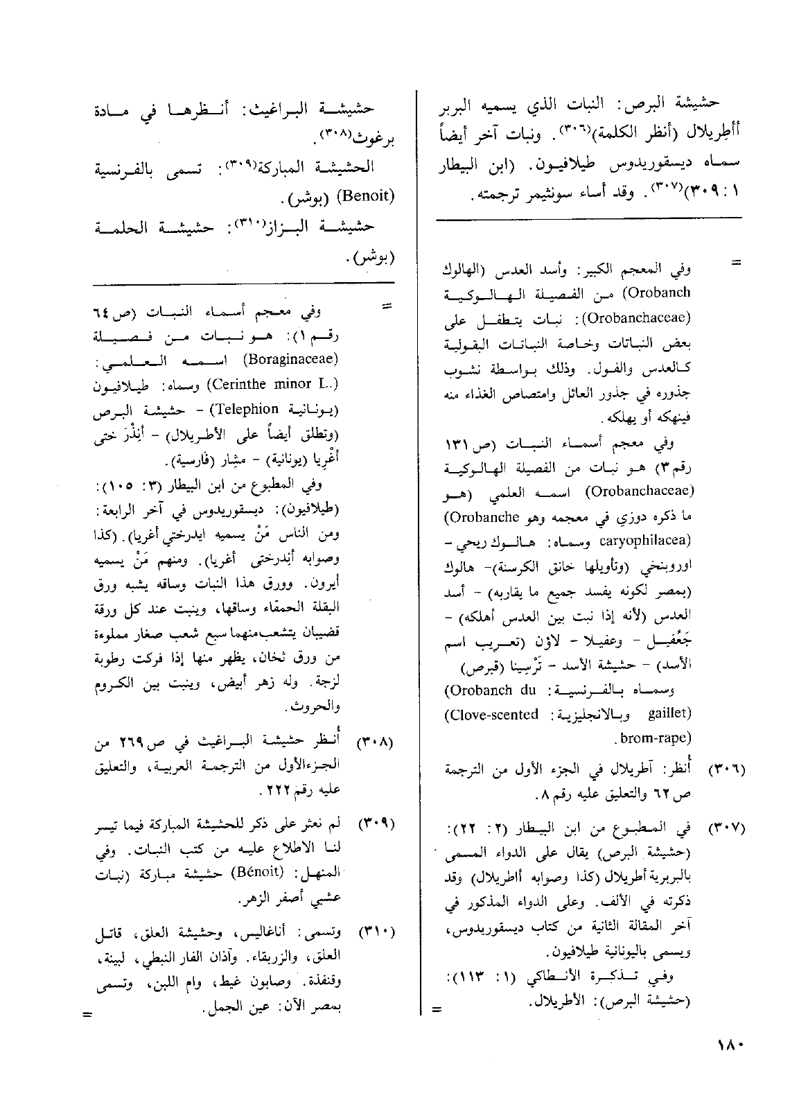 حشيشة البرص: النبات الذي يسميه البربر أأطِريلال (انظر الكلمة). ونبات آخر أيضاً سماه ديسقوريدوس طيلافيون. (ابن البيطار 1: 309) وقد أساء سونثيمر ترجمته.