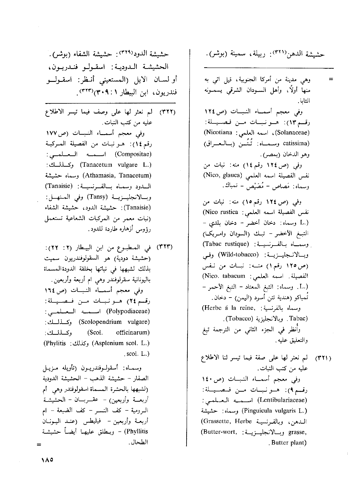 الحشيشة الدودية: أقولو فندريون، أو لسان الأيل (المستعيني انظر: اسقولو فندريون، ابن البيطار 1: 309).