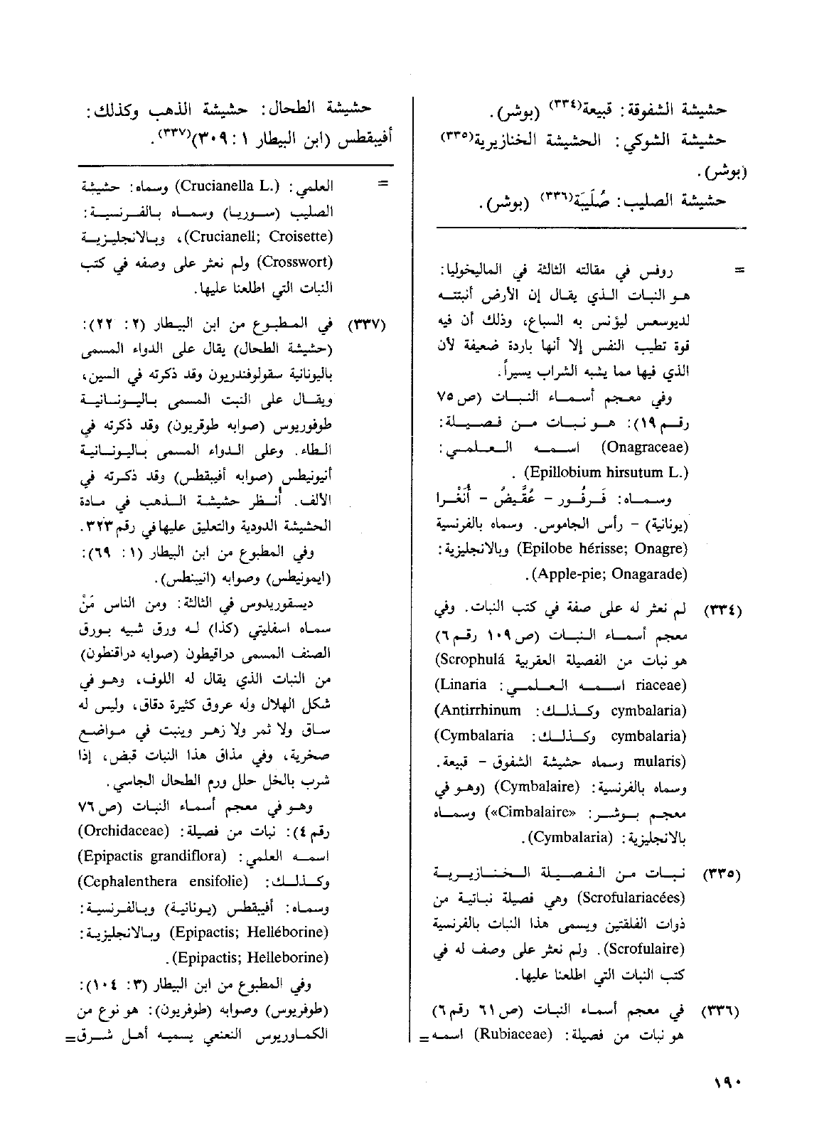 حشيشة الصليب: صُلَيبَة (336) (بوشر) حشيشة الطحال: حشيشة الذهب وكذلك: أفيبقطس (ابن البيطار 1: 309) (337).