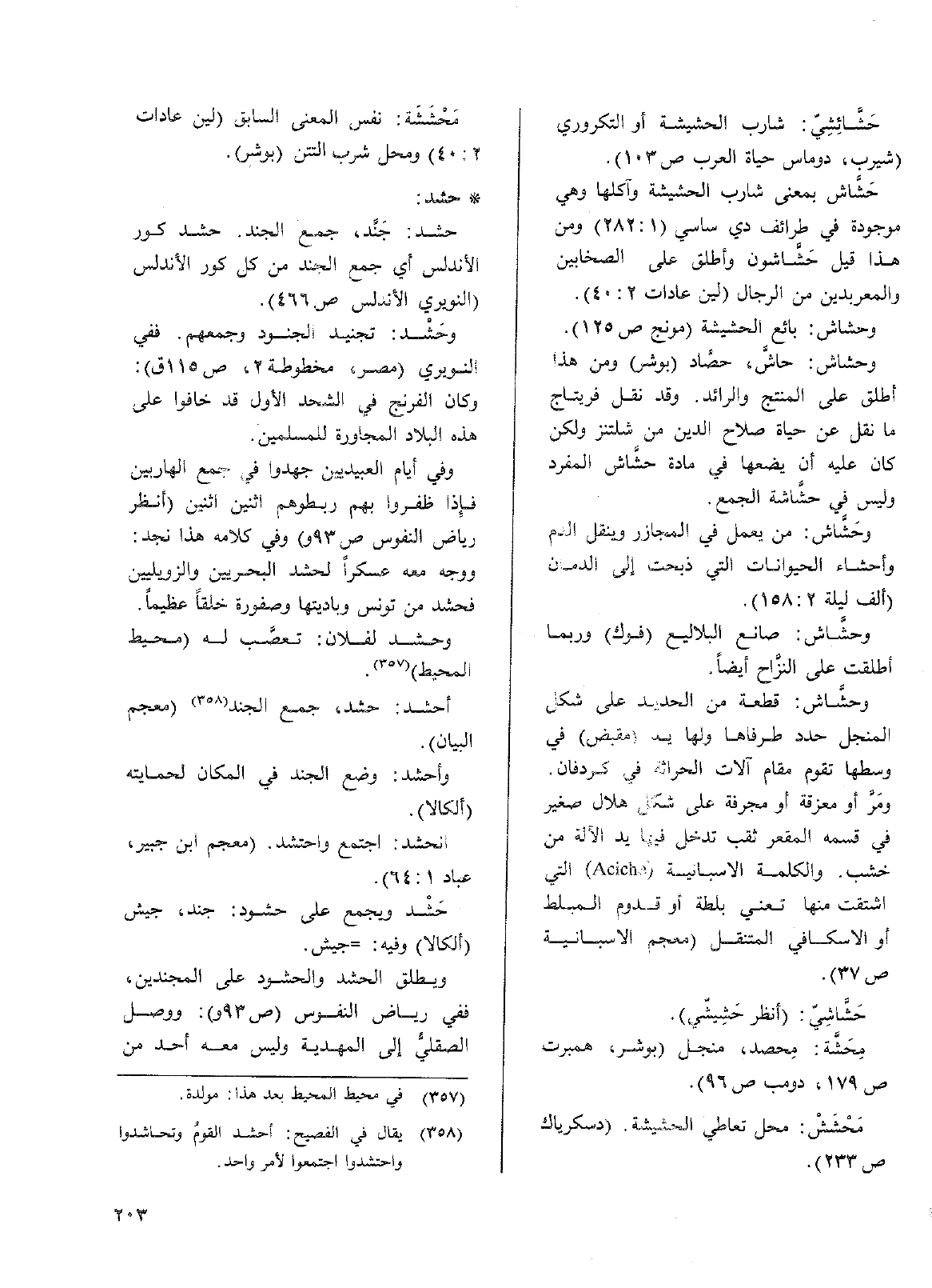 وحشاش: حاشَّ، حصَّاد (بوشر) ومن هذا أطلق على المنتج والرائد وقد نقل فريتاج ما نقل عن حياة صلاح الدين من شلتنز ولكن كان عليه ان يضعها في مادة حشَّاش المفرد وليس في حشَّاشة الجمع.