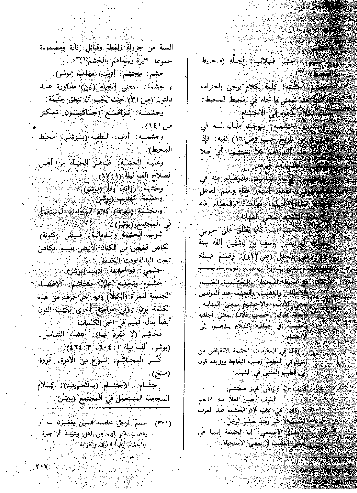 حشمي: ذو حشمة. أديب (بوشر) حَشُّوم وتجمع على حشاشم: الأعضاء الجنسية للمرأة (ألكالا) وفيه آخر حرف من هذه الكلمة نون. وفي مواضع اخرى يكتب النون أيضاً بدل الميم في آخر الكلمات.