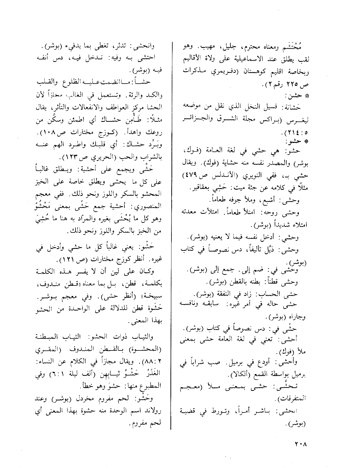• حشو: حشو: هي حشي في لغة العمة (فوك، بوشر) والمصدر نفسه من حشاية (فوك). ويقال حشي ب، ففي النويري (الأندلس ص479) مثلاً في كلامه عن جثة ميت: حَشِي بعاقاقير.