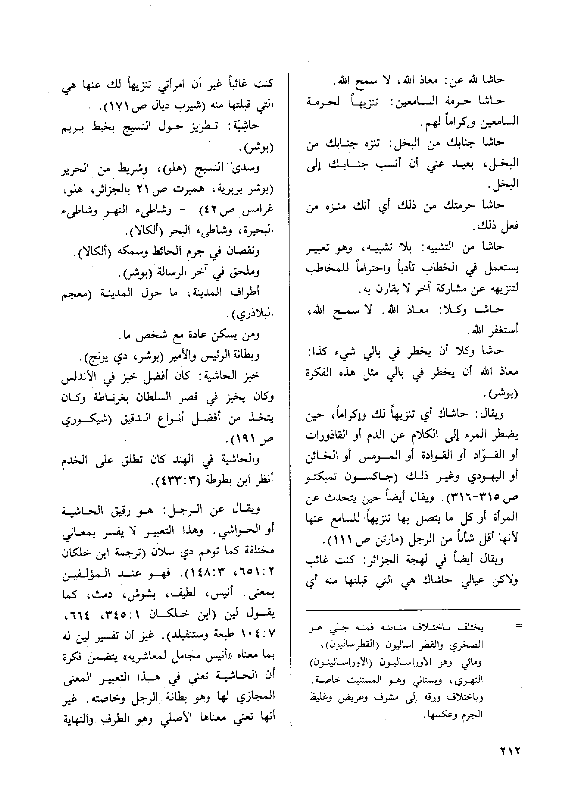 ويقال عن الرجل: هو رقيق الحاشية أو الحواشي. وهذا تفسير لا يفسر بمعاني مختلفة كما توهم دي سلان (ترجمة ابن خلكان 2: 651، 3: 148) فهو عند المؤلفين بمعنى أنيس، لطيف، بشوش، دمث، كما يقول لين (ابن خلكان 1: 345، 664، 7: 104 طبعة وستنفيلد). غير أن تفسير لين له بما معناه ((أنيس مجامل لمعاشرية)) يتضمن فكرة أن الحاشية تعني في هذا التغبير المعنى المجازي لها وهو بطانة الرجل وخاصته. غير إنها تعني معناها الأصلي وهو الطرف والنهاية