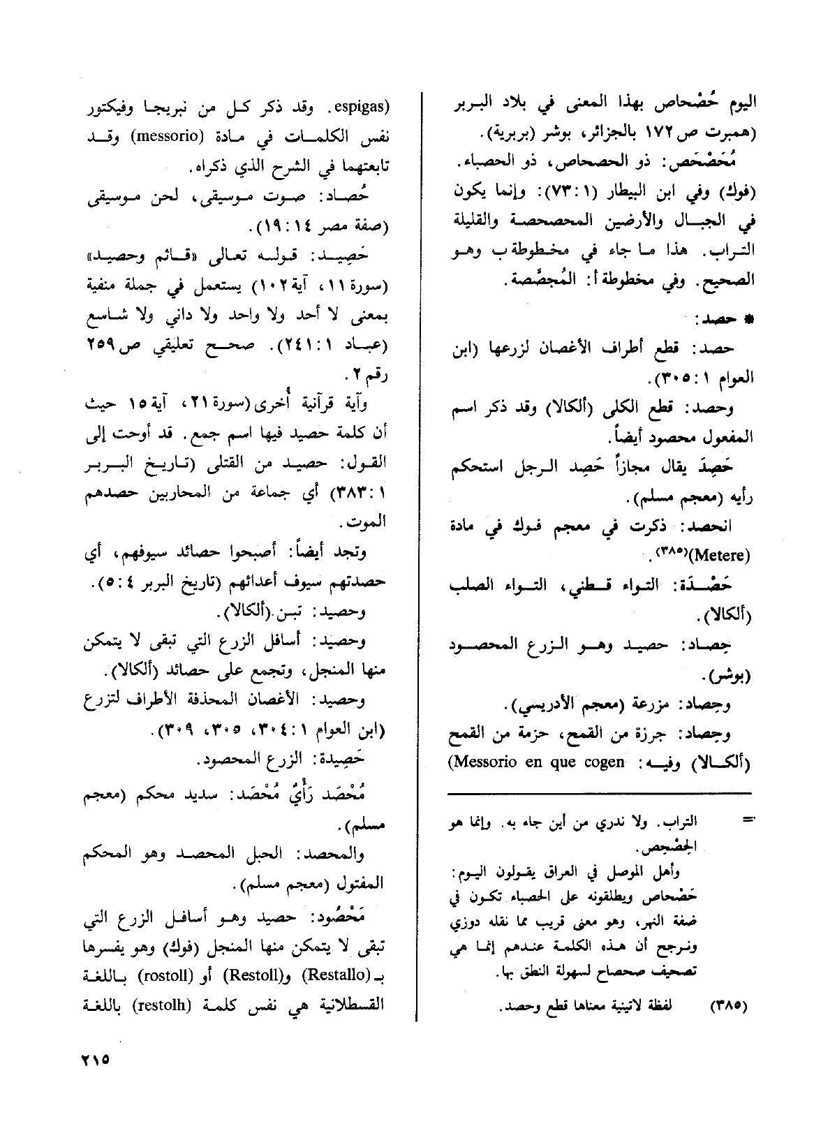 وحِصاد: جرزة من القمح، حزمة من القمح (ألكالا) وفيه: ( Messorio en que cogen espigas) وقد ذكر كل من نبريجا وفكتور نفس الكلمات في مادة ( messprio) وقد تابعتها في الشرح الذي ذكراه.