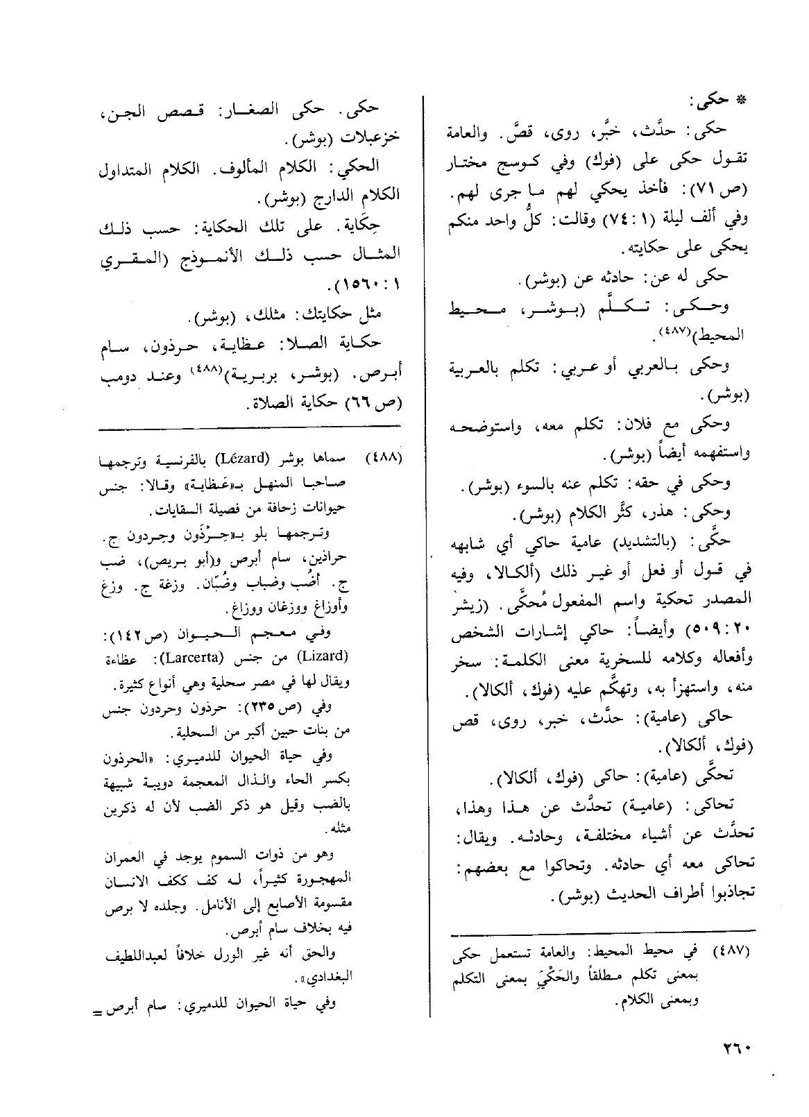 • حكى: حكى: حدَّث، حبَّر، روى، قصَّ والعامة تقول حكى على (فوك) وفي كوسج مختار (ص71): فأخذ يحكي لهم ما جرى لهم. وفي ألف ليلة (1: 74) وقالت: كلُّ واحد منكم يحكي على حكايته.
