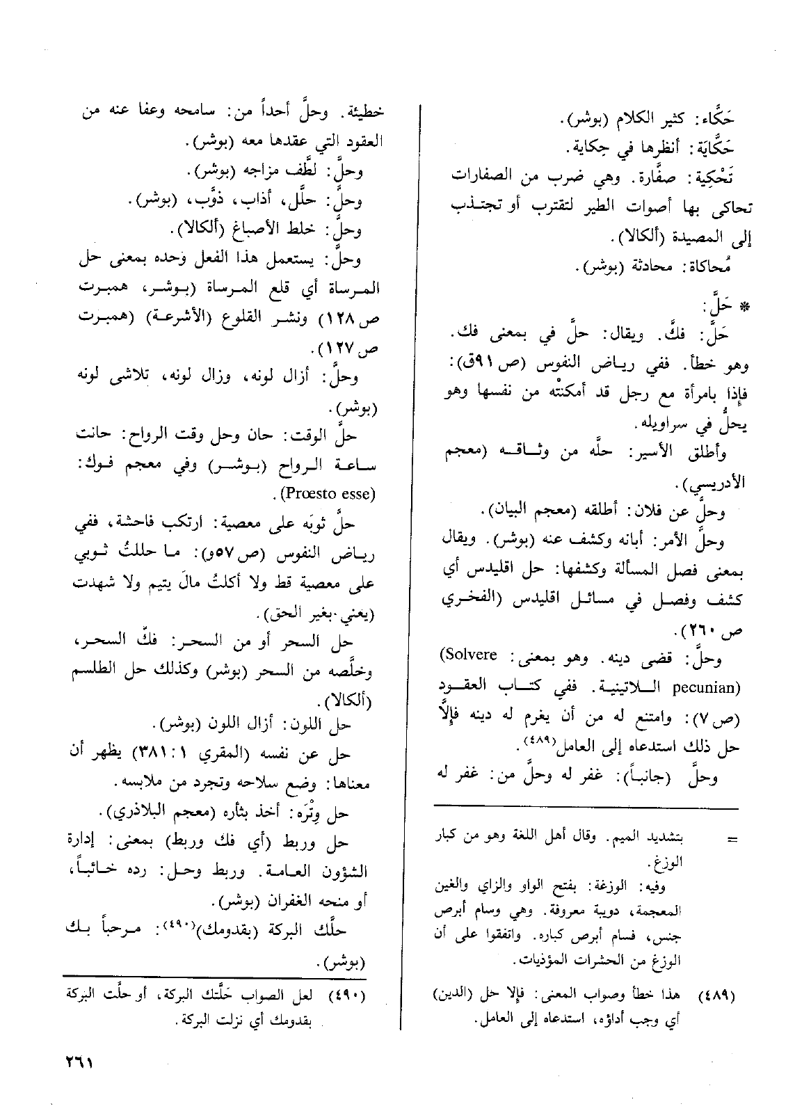 وحلَّ: قضى دينه. وهو بمعنى: ( Solvere pecunian) اللاتينية. ففي كتاب العقود (ص7): وامتنع له من أن يغرم له ديناً فألاَّ حل ذلك استدعاه إلى العامل.