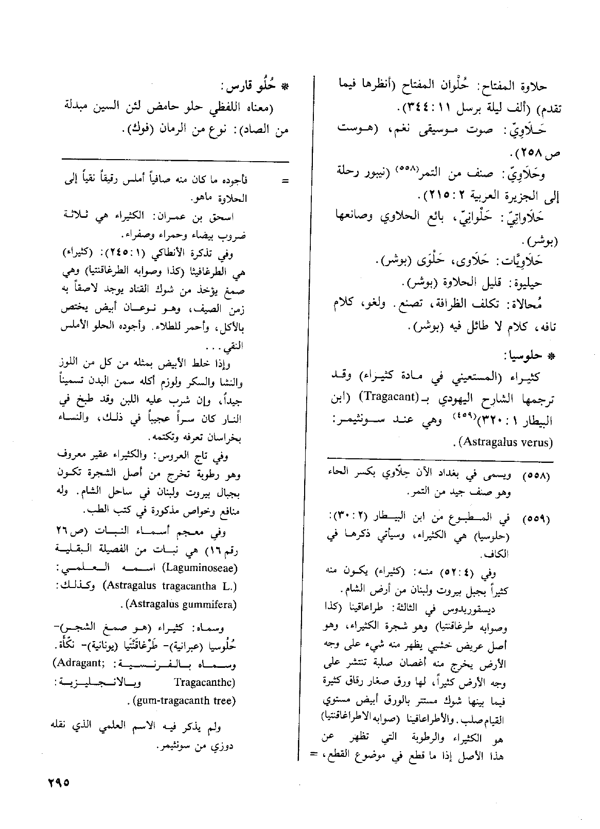 • حلوسيا: كثيراء (المستعيني في مادة كثيراء) وقد ترجمها الشارح اليهودي ب ( Tragacant) ( ابن البيطار 1: 320) (559) وهي عند سونثيمر: ( Astragalus verus) .