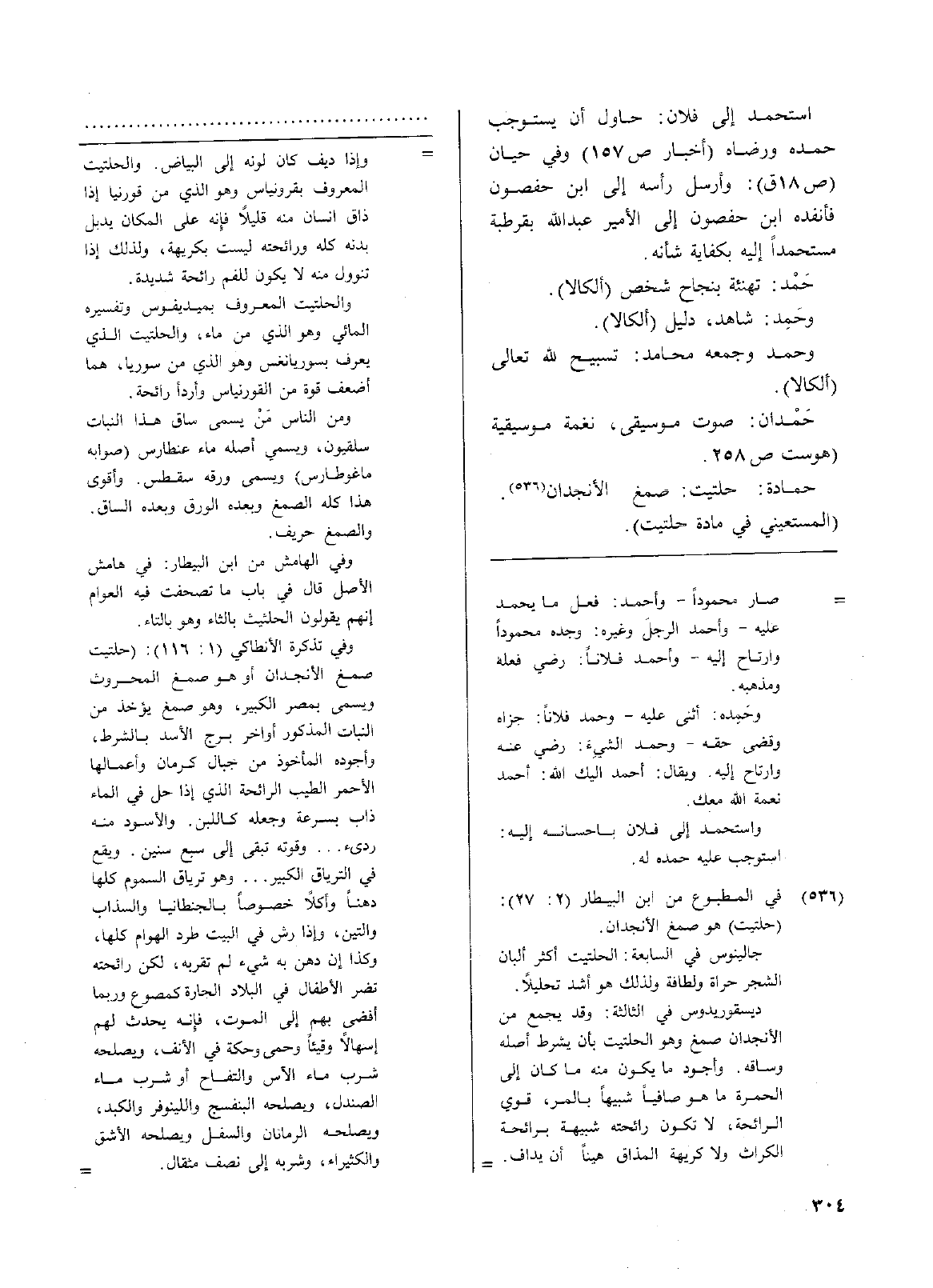 وحَمِد: شهاد، دليل (ألكالا) وحمد وجمعه محامد: تسبيح لله تعالى (ألكالا).