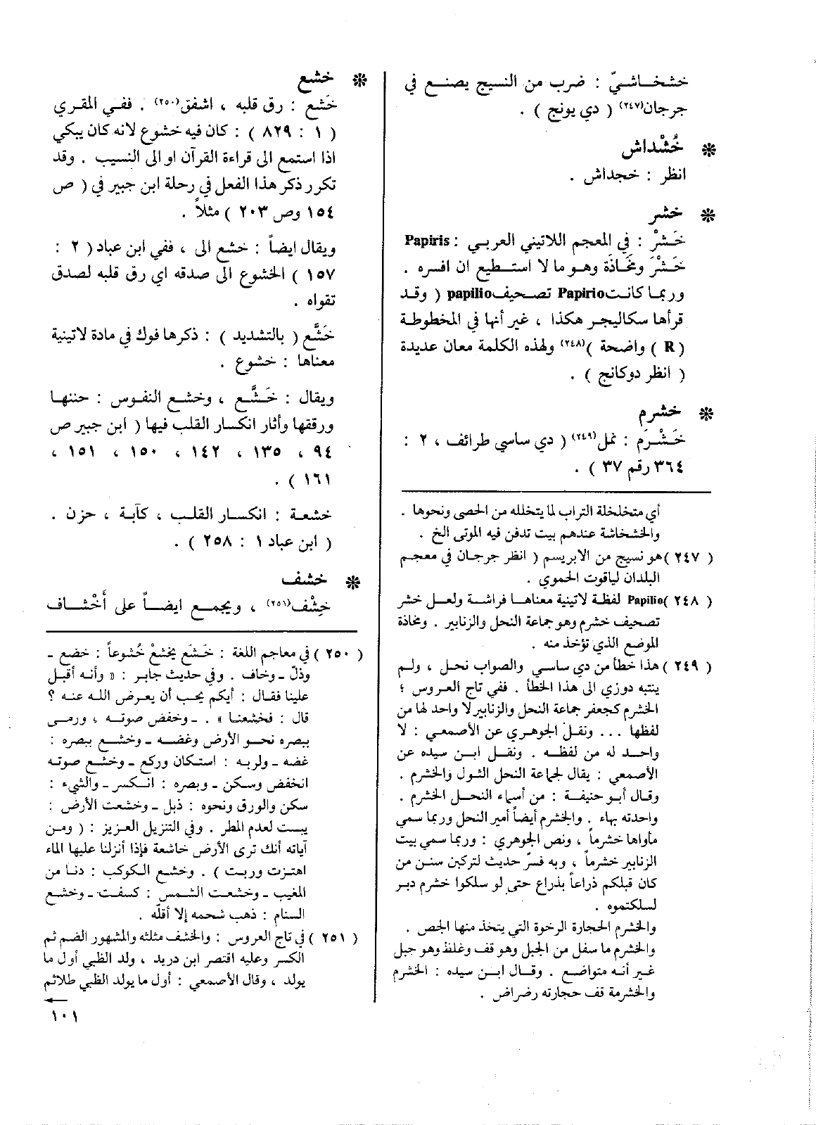 • خشر: خَشْر: في المعجم اللاتيني العربي: papiris خَشْرَ ومَخَاذَة وهو ما لا أستطيع أن أفسره. وربما كانت Papriro تصحيف papilio ( وقد قرأها سكاليجر هكذا، غير أنها في المخطوطة ( R) واضحة) ولهذه الكلمة معان عديدة (انظر دوكانج).