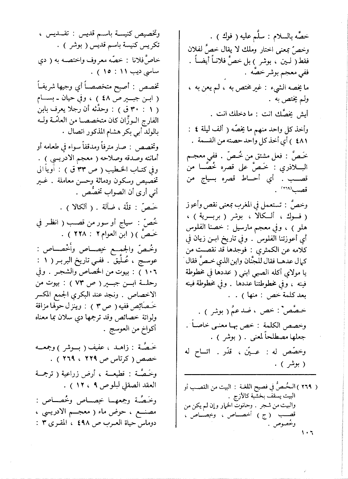 وخُصّ والجمع خِصاص وأَخْصاص: عوسج، عُلَّيق. ففي تاريخ البربر (1: 106): بيوت من الخصاص والشجر. وفي رحلة ابن جبير (ص73): بيوت من الاختصاص. ونجد عند البكري الجمع المكسر خصائص ففيه (ص3): وينزل حولها مزاقة ولواتة خصائص وقد ترجمها دي سلان بما معناه أكواخ من العوسج.