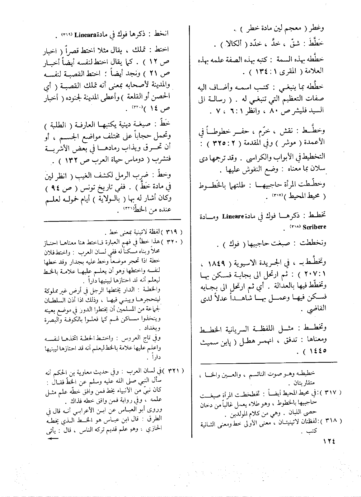 وخطَّط: نقش، خرّم، حفر خطوطاً في الأعمدة (موشر) وفي المقدمة (2: 325): التخطيط في الأبواب والكراسي. وقد ترجمها دي سلان بما معناه: وضع النقوش عليها.