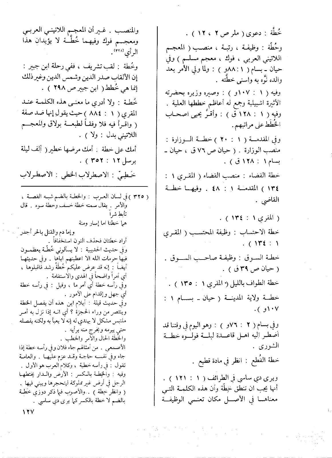 وفيه (1: 107و): وصيره وزيره بحضرته الأثيرة اشبيلية وجمع له أعاظم خططها العلية. وفيه (1: 128ق): وأقر يحيى أصحاب الخُطّط على مراتبهم.