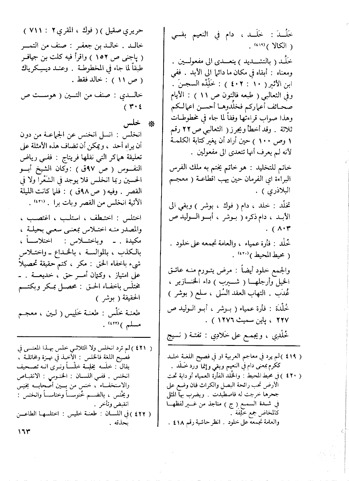 • خلس: انخلس: انسل انخنس عن الجماعة من دون أن يراه أحد. ويمكن أن تضاف هذه الأمثلة على تعليقه هماكر التي نقلها فريتاج: ففي رياض النفوس (ص97 ق): وكان الشيخ أبو الحسين ربما انخلس فلا يوجد في الشعرا ولا في القصر. وفيه (ص98 ق): فلما كانت الليلة الآتية انخلس من القصر وبات برا.