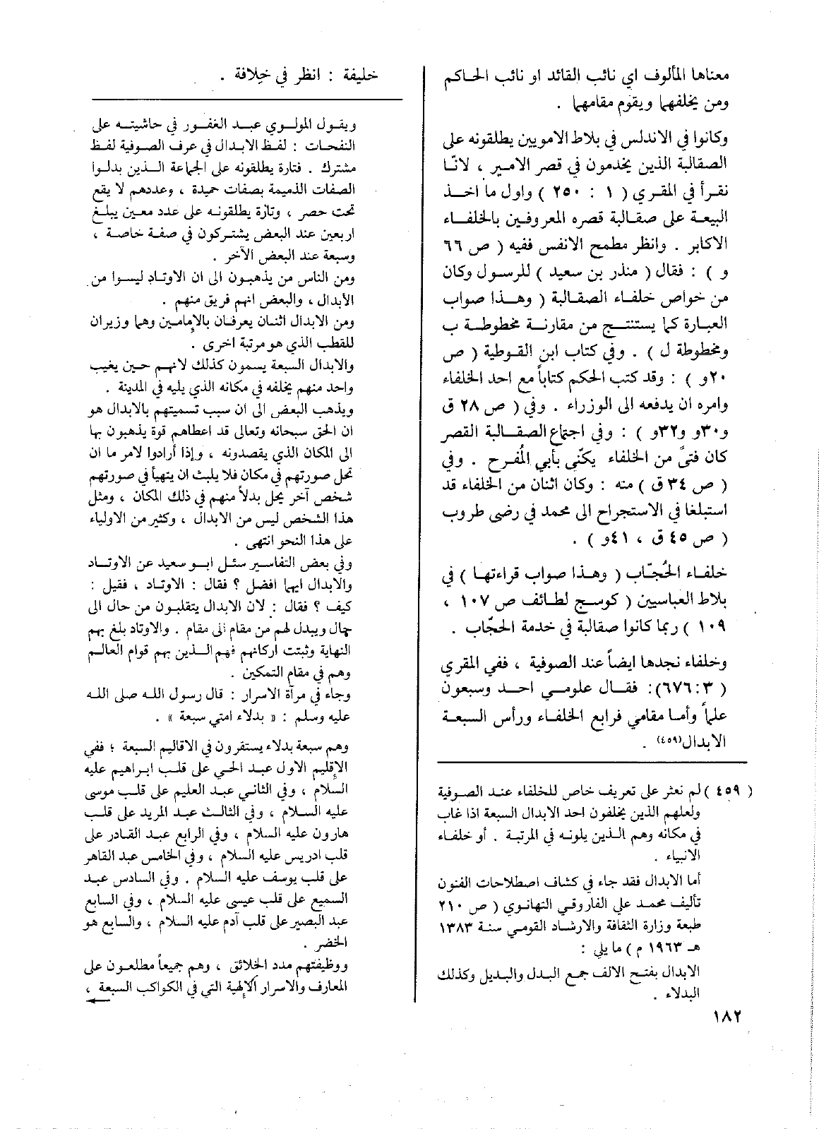 وخلفاء نجدها أيضاً عند الصوفية، ففي المقري (3: 676): فقال علومي أحد وسبعون علماً وأما مقامي فرابع الخلفاء ورأس السبعة الأبدال.